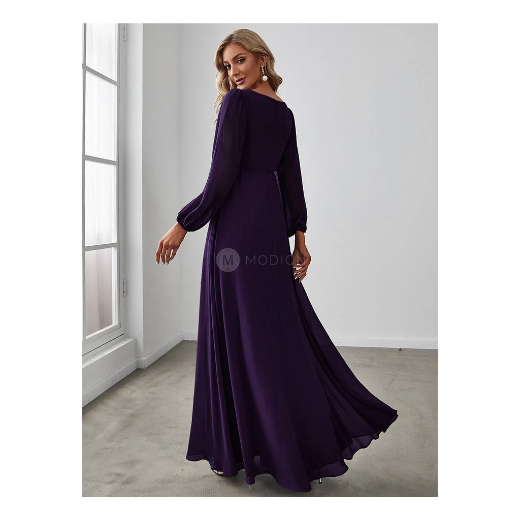 Elegantní společenské šaty pro plnoštíhlé v tmavě fialové barvě působí majestátně a smyslně. Výstřih do V krásně zvýrazní dekolt, zatímco dlouhé rukávy s průstřihem dodají modelu vzdušnost a originalitu. Pas je zdoben luxusní krajkovou aplikací s jemným leskem, která opticky tvaruje siluetu. Áčková splývavá sukně se pohybuje s lehkostí a podtrhuje celkový elegantní vzhled.