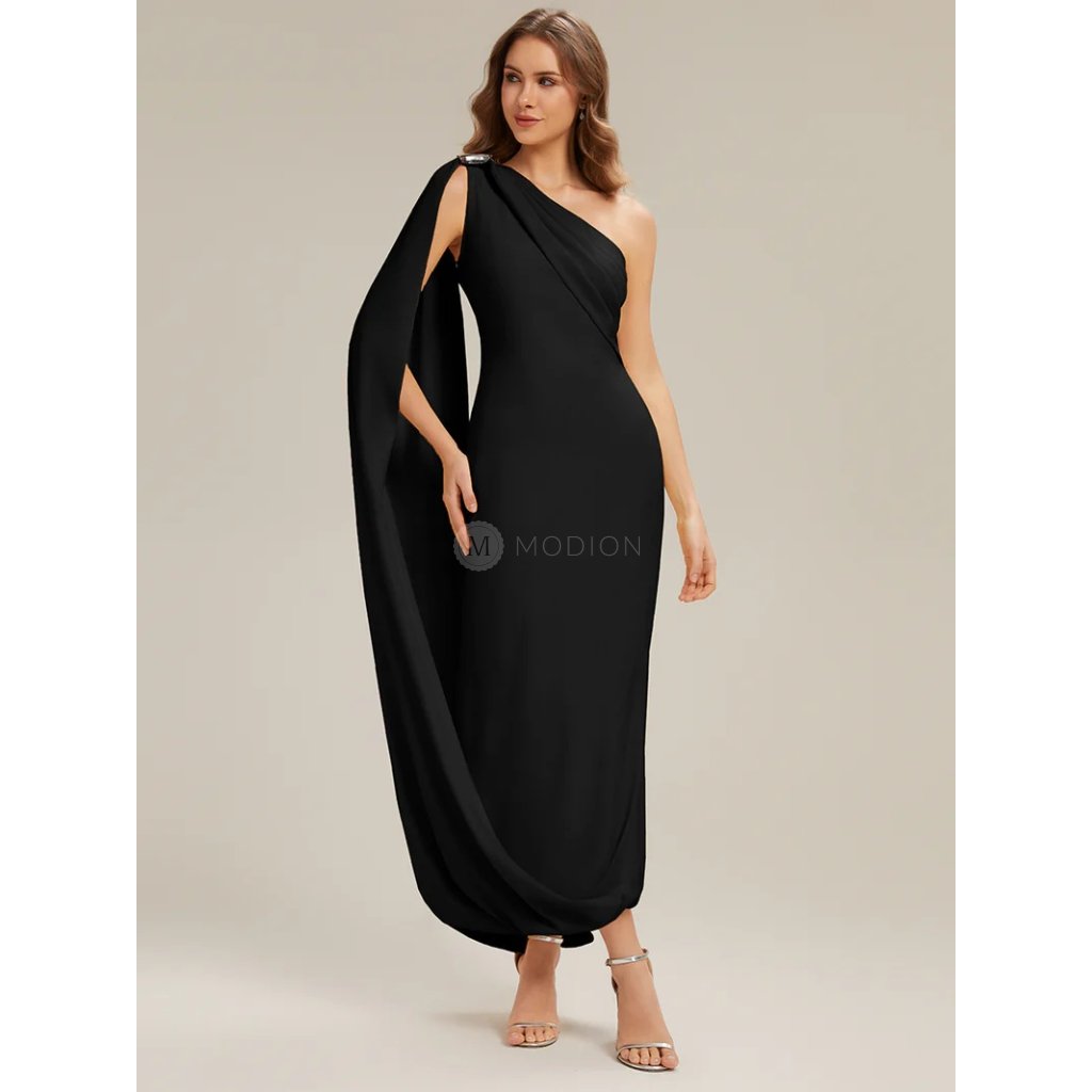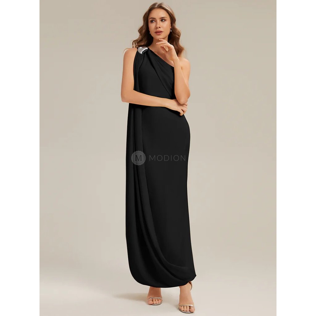 Asymetrický výstřih na jedno rameno působí velmi ženským a stylovým dojmem. Rameno je luxusně zdobené výraznou aplikací, která dodává modelu exkluzivní charakter. Efektní splývavý šifonový prvek na jednom boku vytváří dramatický vizuální efekt a při pohybu působí velmi elegantně.