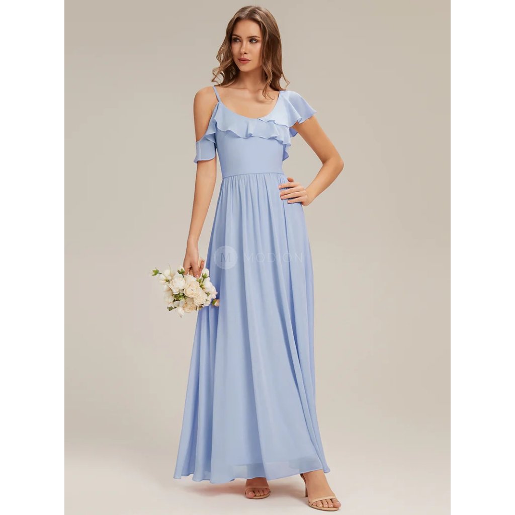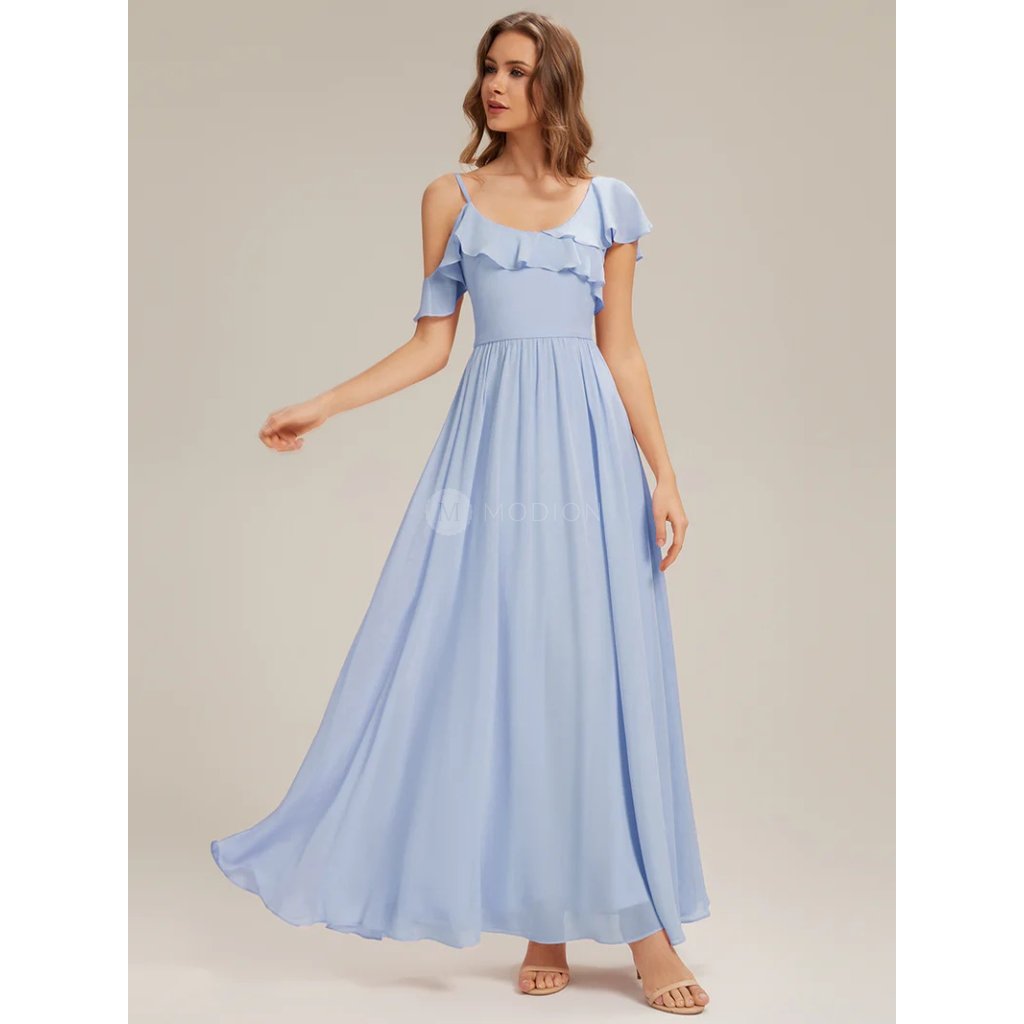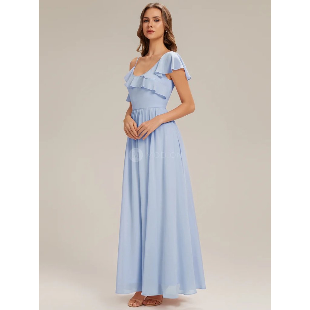 Společenské šaty Capri: Ledově modré dlouhé šifonové šaty v áčkovém střihu s volánky a originálním živůtkem. Elegantní šaty na svatbu, ples i slavnostní večer.