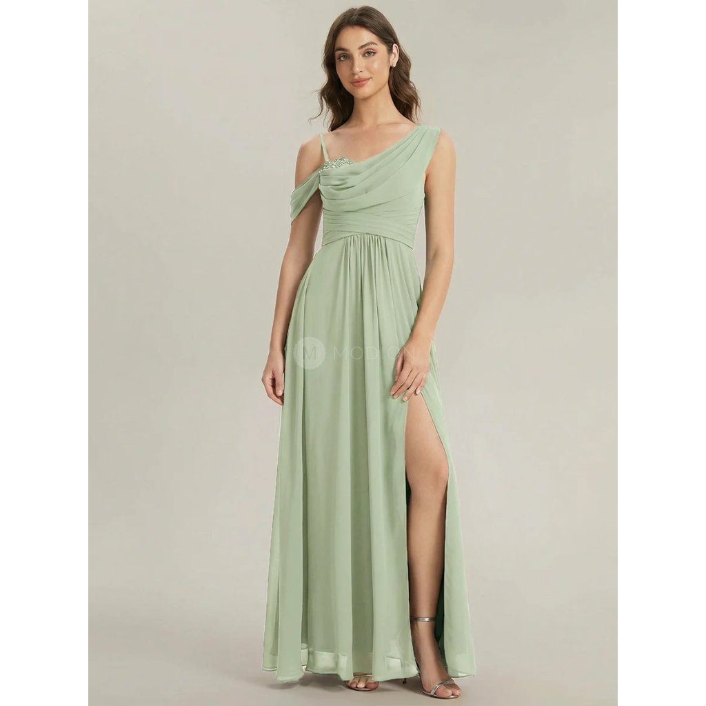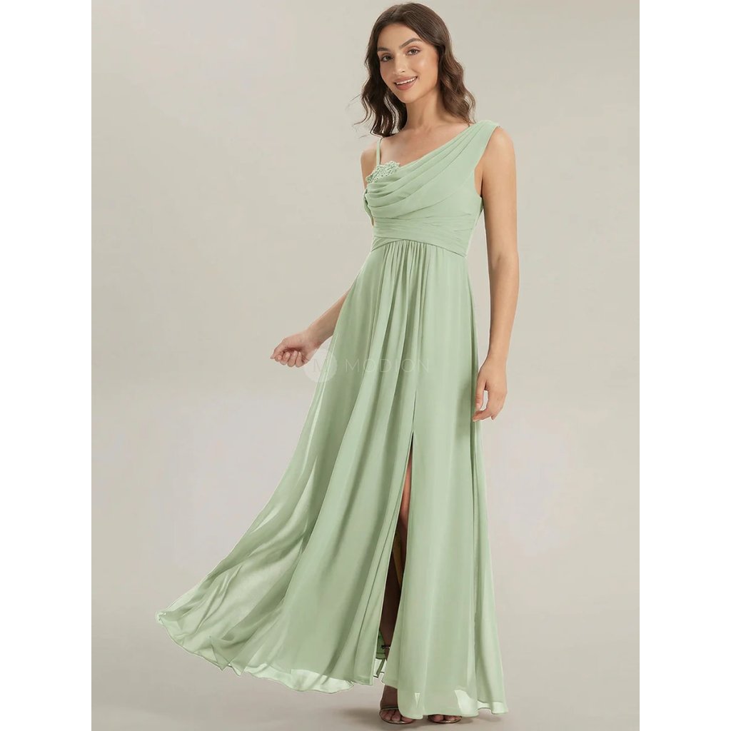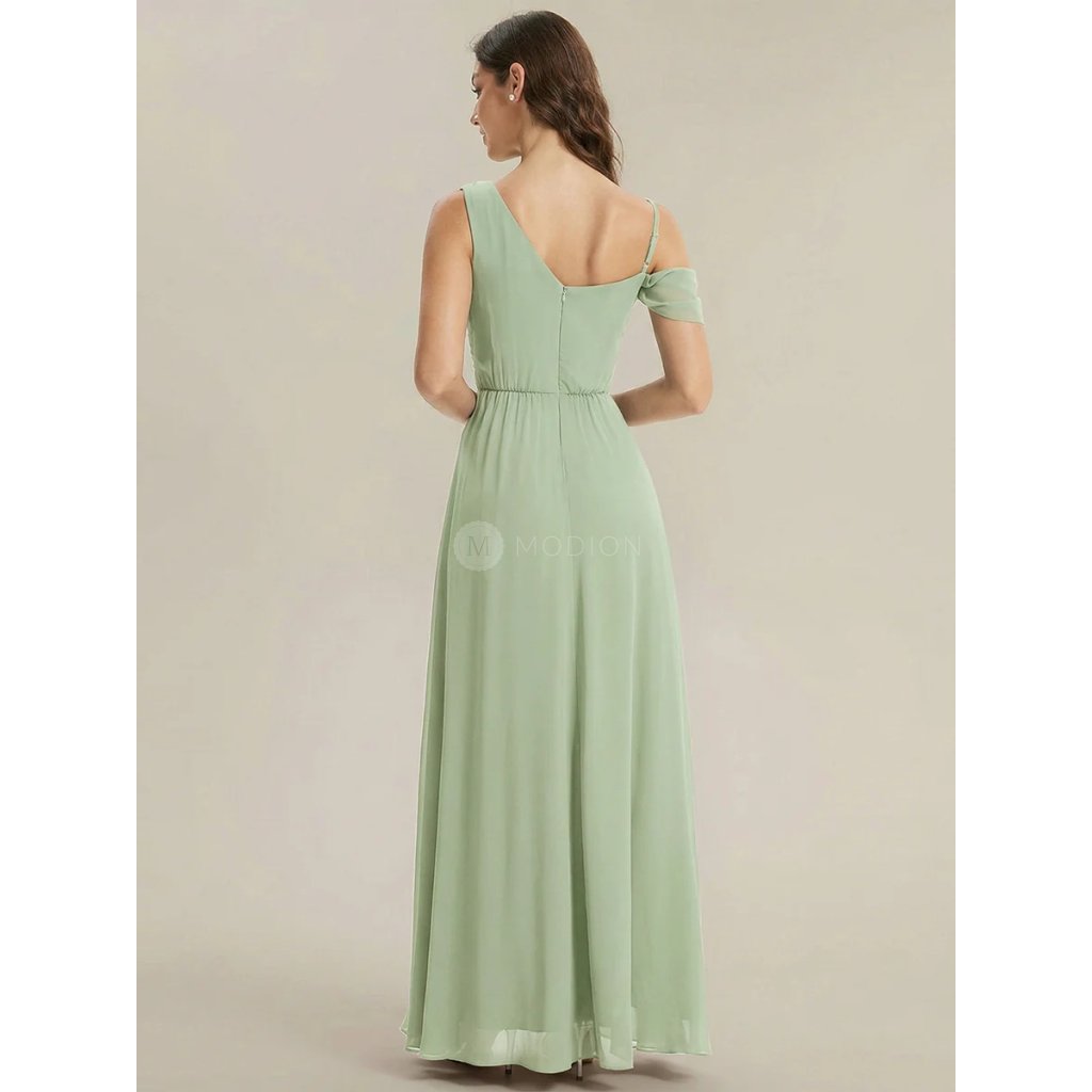Dlouhé mátově zelené společenské šaty z lehkého šifonu na jedno rameno působí svěže, jemně a velmi elegantně. Mátový odstín dodává modelu lehkost, romantický nádech a přirozený slavnostní vzhled, díky čemuž jsou ideální volbou pro svatební i letní společenské události.