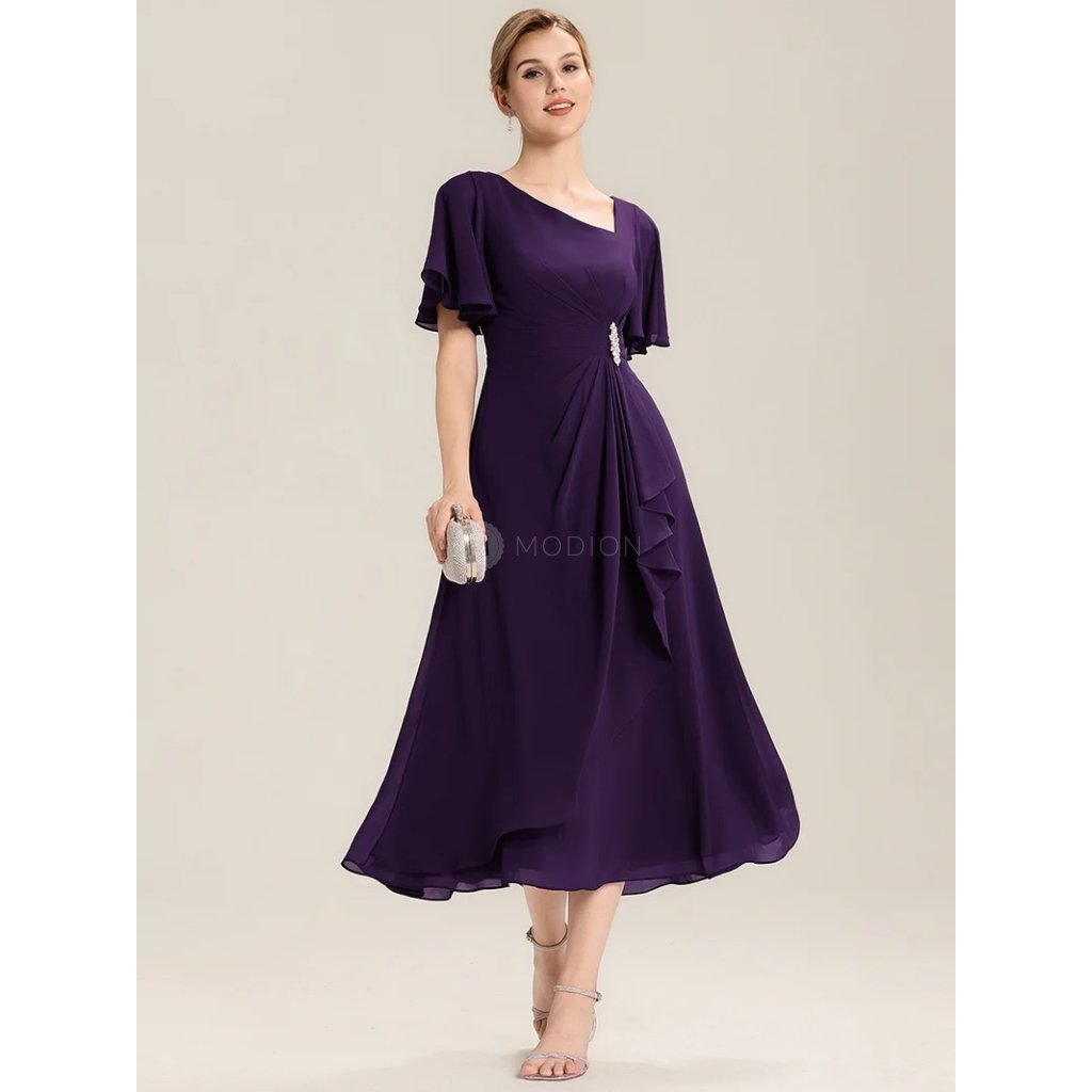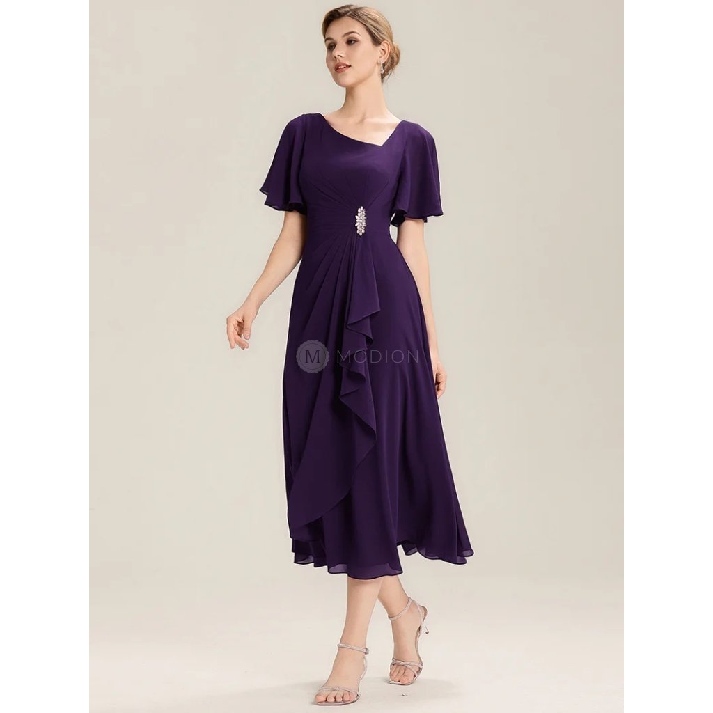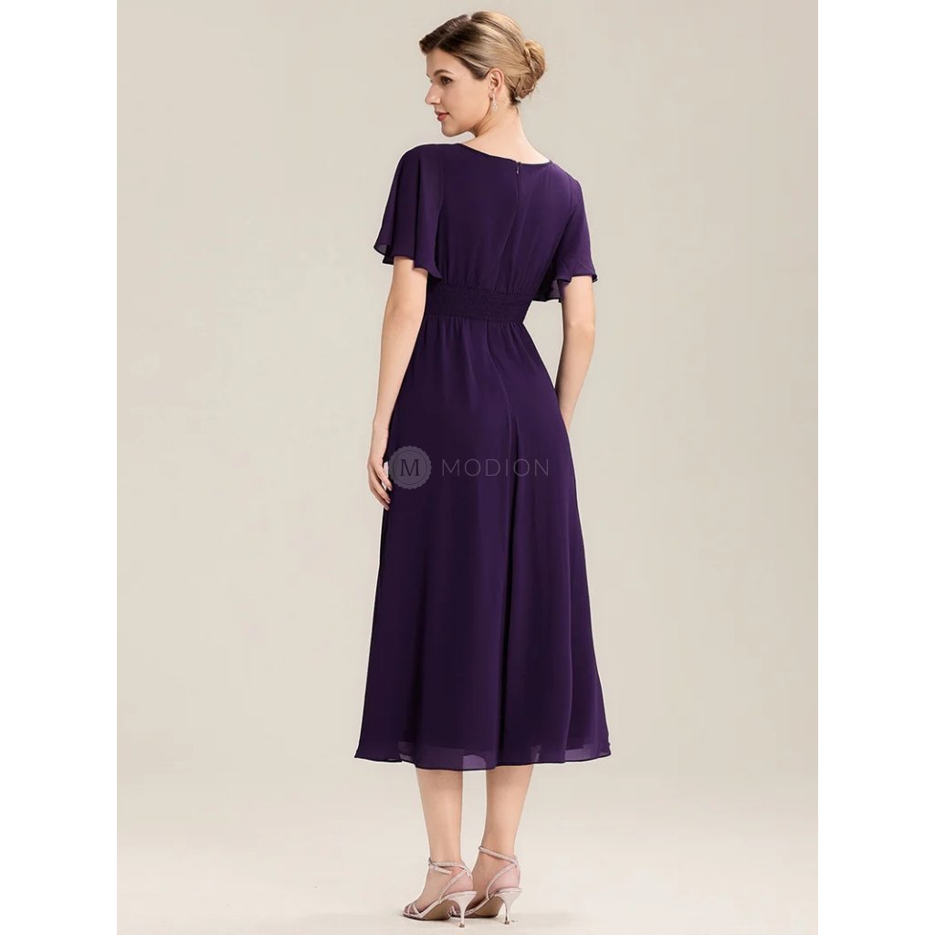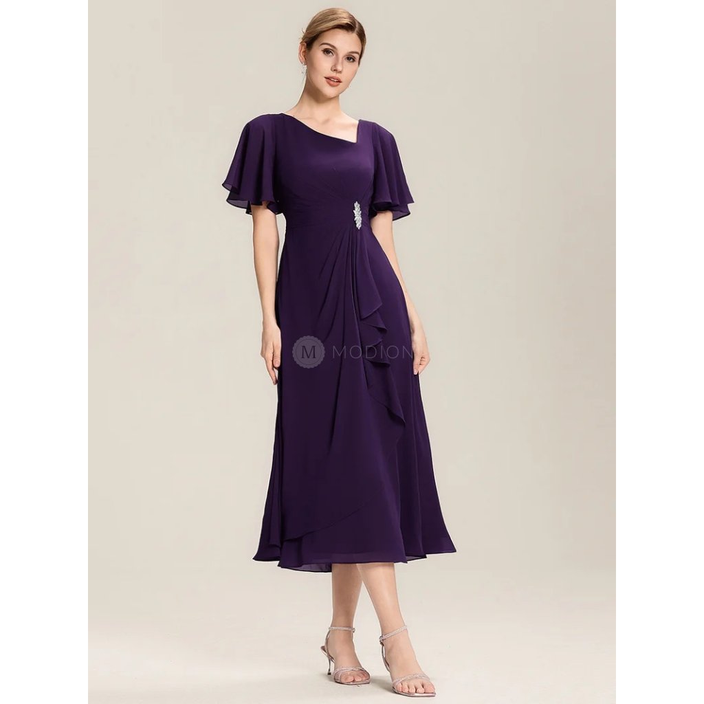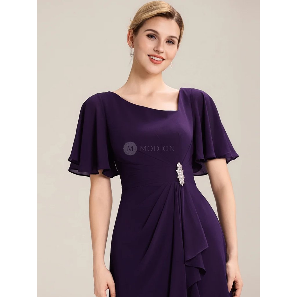 Midi fialové společenské šaty z lehkého šifonu s asymetrickým výstřihem působí luxusně, výrazně a velmi elegantně. Fialový odstín dodává modelu sofistikovaný a slavnostní charakter, díky čemuž jsou ideální volbou pro ženy, které chtějí vyniknout originálním detailem a zároveň zachovat nadčasový vzhled.