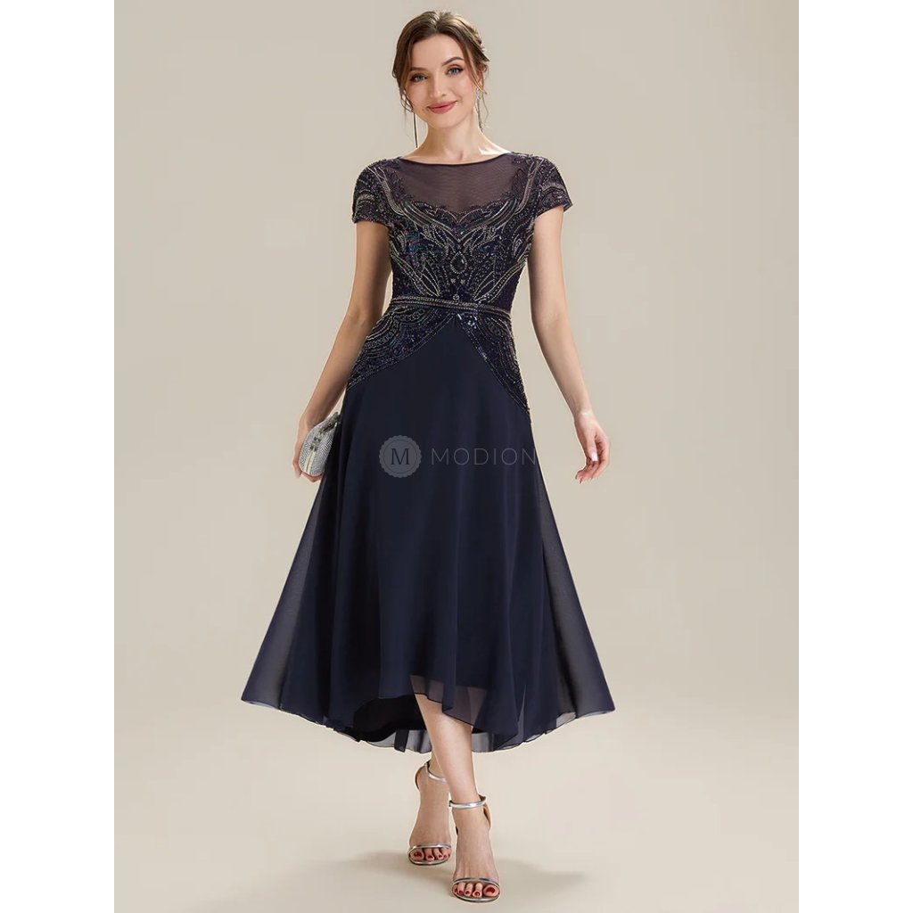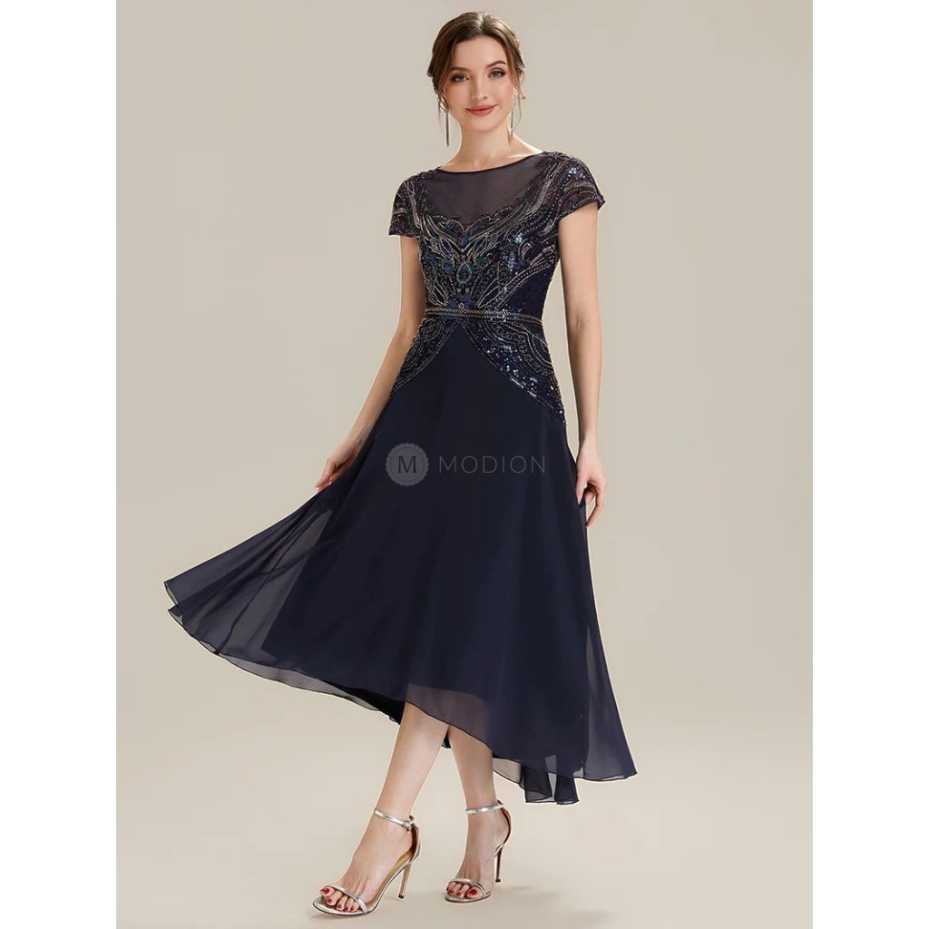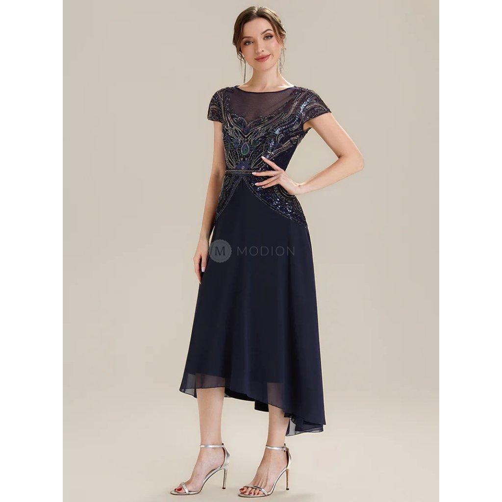 Společenské šaty Bellamonte: Tmavě modré midi šaty v áčkovém střihu s flitrovým živůtkem a šifonovou sukní. Elegantní na ples i svatbu.