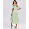 Světle zelené šaty z lehkého šifonu zdobené jemným květinovým vzorem působí svěže a romanticky. Asymetrický střih s kratší přední částí a delším zadním dílem opticky prodlužuje postavu a dodává šatům lehkost. Tenká ramínka doplňují spadené rukávy, které jemně odhalují ramena a podtrhují ženskou eleganci. Áčková plisovaná sukně se při chůzi volně pohybuje a působí vzdušně.