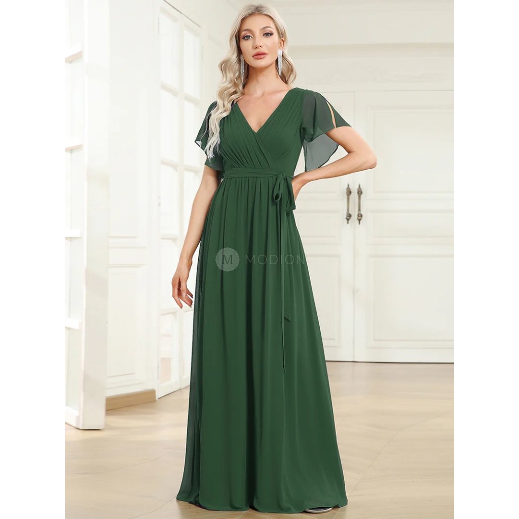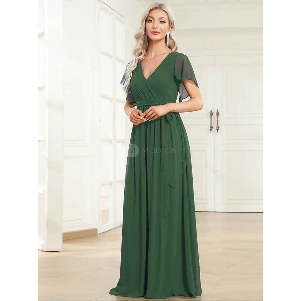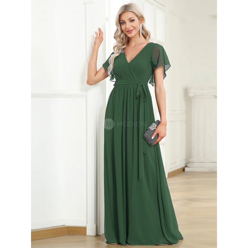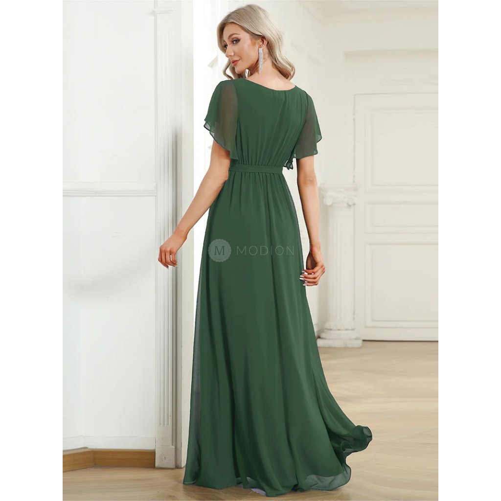 Dlouhé zelené eukalyptové společenské šaty z lehkého šifonu působí jemně, svěže a velmi elegantně. Tlumený eukalyptový odstín s lehce chladným podtónem dodává modelu přirozenou lehkost, sofistikovanost a nadčasový vzhled, díky čemuž jsou šaty ideální volbou pro slavnostní události, společenské příležitosti i letní večery.