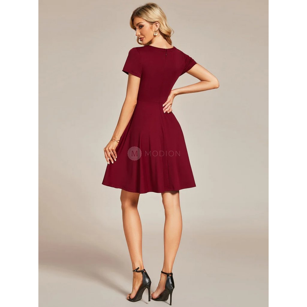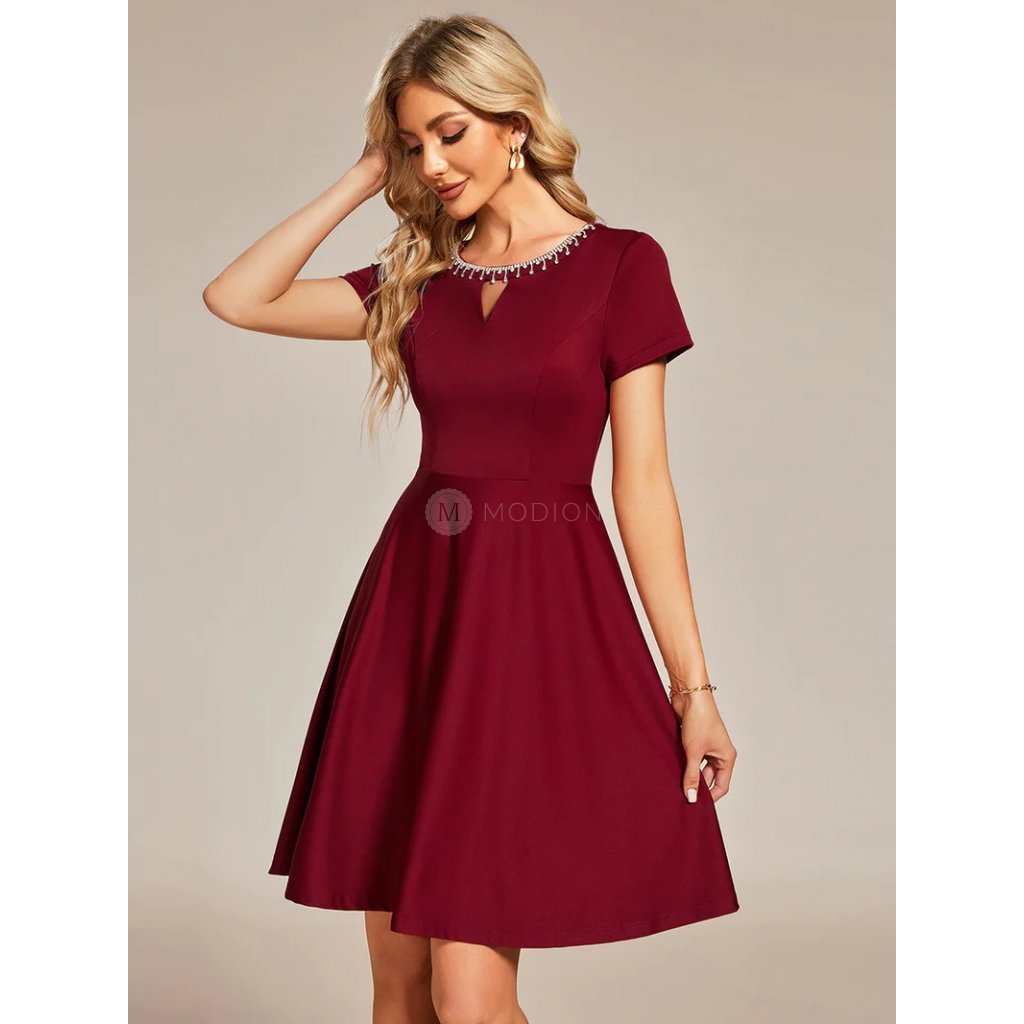 Vínové společenské šaty s koktejlovým střihem do áčka, kulatým výstřihem se slzou a luxusním třpytivým zdobením výstřihu. Sukně s elegantním zdobením podtrhuje nezapomenutelný vzhled. Ideální volba na svatby, večírky, slavnosti, divadelní představení i jiné společenské události.