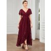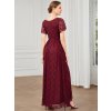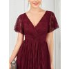 Společenské krajkové šaty vínové barvy působí elegantně a slavnostně. Jemná krajka s květinovým vzorem a mírně poddajný materiál se příjemně přizpůsobí postavě. Asymetrický dlouhý střih s midi délkou vpředu dodává modelu lehkost a moderní šmrnc. Výstřih do V lichotí dekoltu, krátké rukávy decentně zakrývají ramena. Tyto večerní šaty jsou ideální volbou na ples, galavečer i svatbu – ať už jako host, svědkyně či družička.