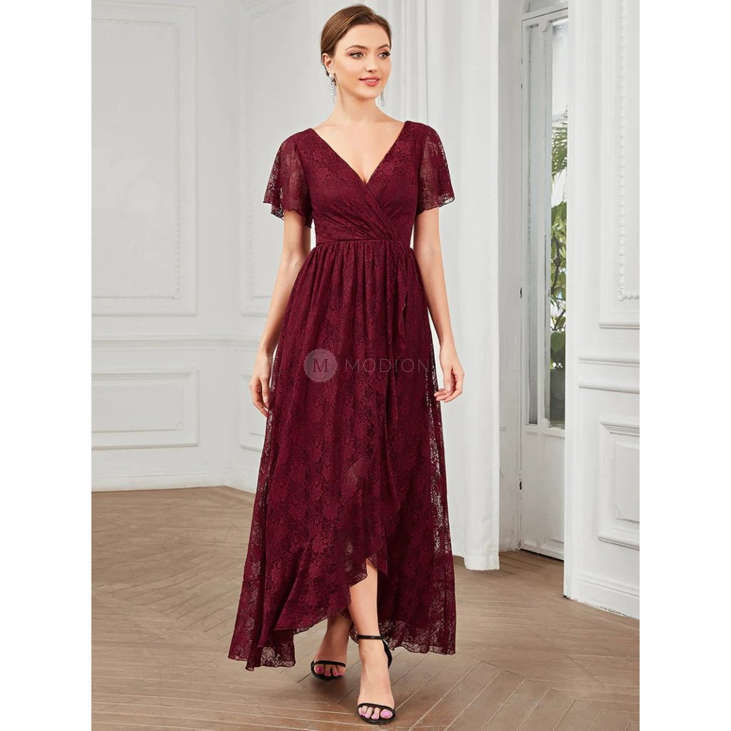 Společenské šaty červené vínové dlouhé krajkové asymetrické  - EE01489BD | Modion.cz
