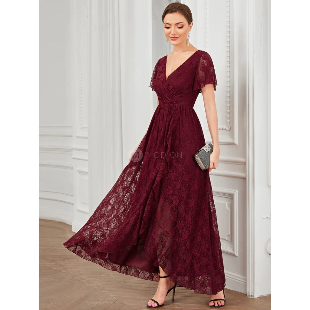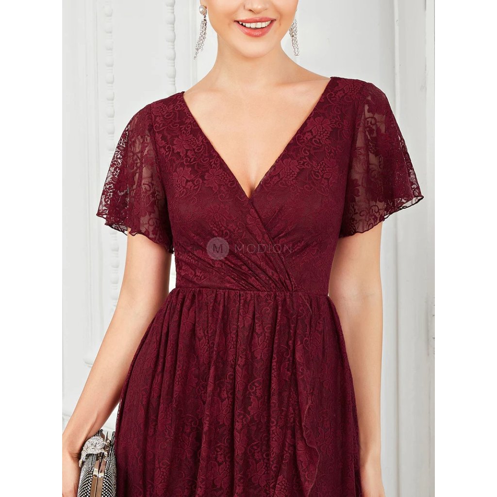 Společenské krajkové šaty vínové barvy působí elegantně a slavnostně. Jemná krajka s květinovým vzorem a mírně poddajný materiál se příjemně přizpůsobí postavě. Asymetrický dlouhý střih s midi délkou vpředu dodává modelu lehkost a moderní šmrnc. Výstřih do V lichotí dekoltu, krátké rukávy decentně zakrývají ramena. Tyto večerní šaty jsou ideální volbou na ples, galavečer i svatbu – ať už jako host, svědkyně či družička.