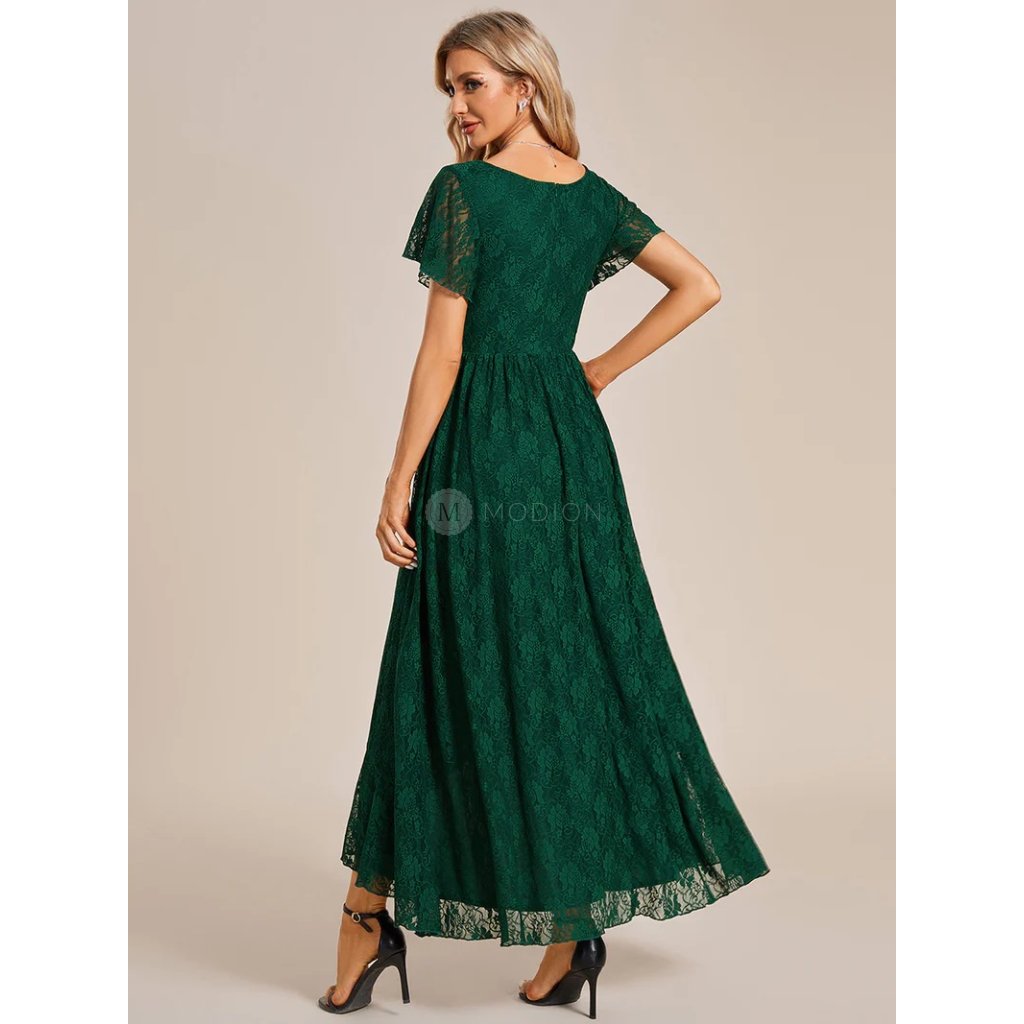 Společenské šaty Adeline: Smaragdově zelené krajkové midi šaty s výstřihem do V a rukávy na svatbu i slavnost.