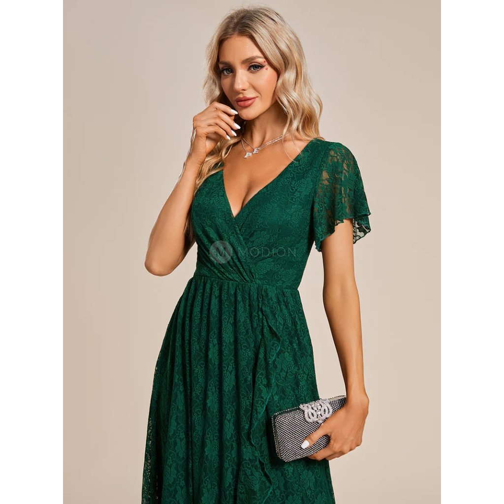 Společenské krajkové šaty ve smaragdově zelené barvě působí luxusně a elegantně. Jemná krajka s květinovým vzorem a mírně poddajný materiál zajišťují pohodlí i atraktivní vzhled. Asymetrický střih – kratší vpředu a delší vzadu – dodává modelu vzdušnost a šmrnc, zatímco výstřih do V zvýrazňuje dekolt. Krátké rukávy decentně zakrývají ramena. Tyto večerní šaty jsou perfektní volbou na ples, svatbu, galavečer nebo slavnostní rodinné události.