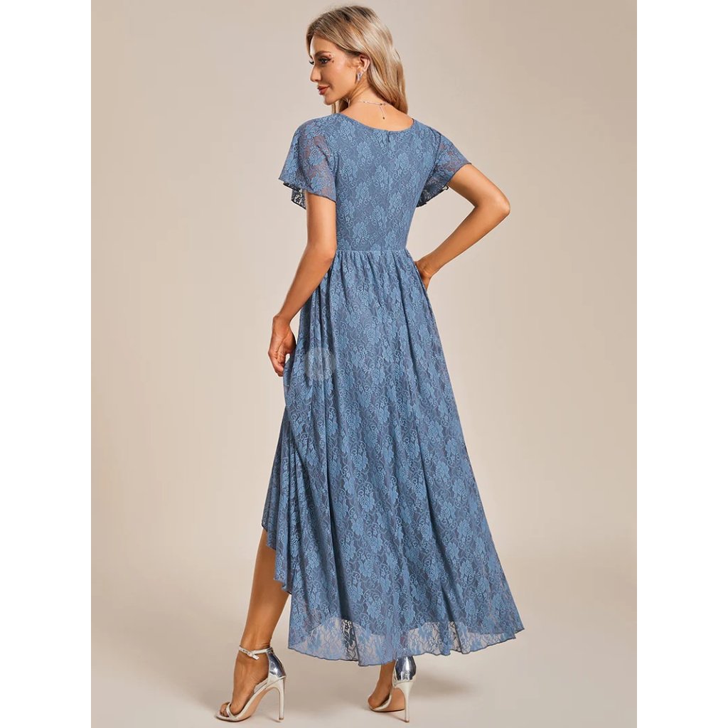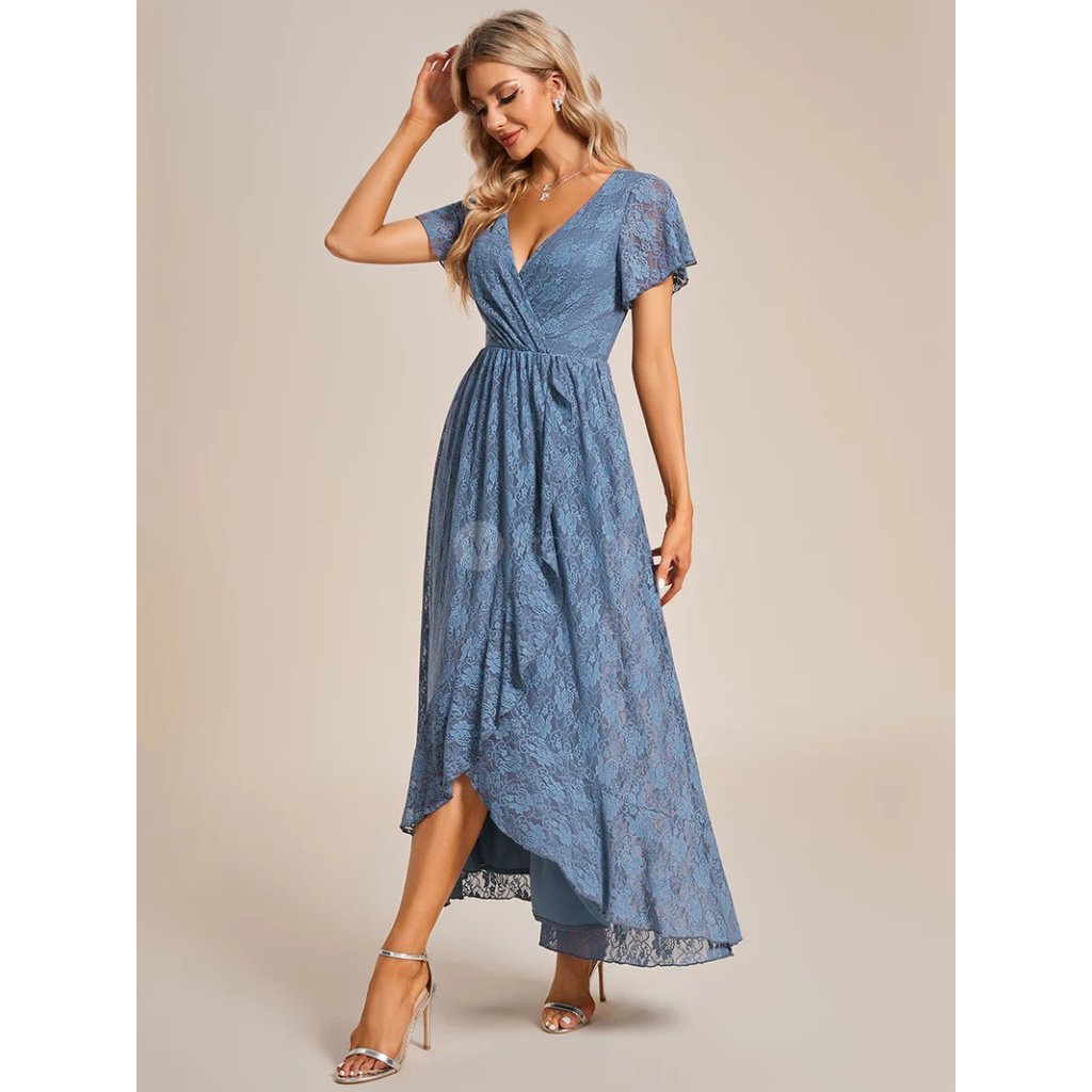 Společenské šaty Adeline: Modrošedé krajkové midi šaty s výstřihem do V a rukávy na svatbu i slavnost.
