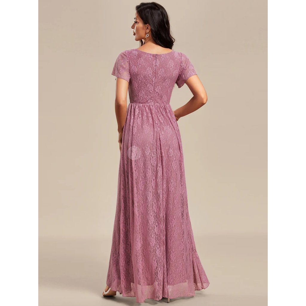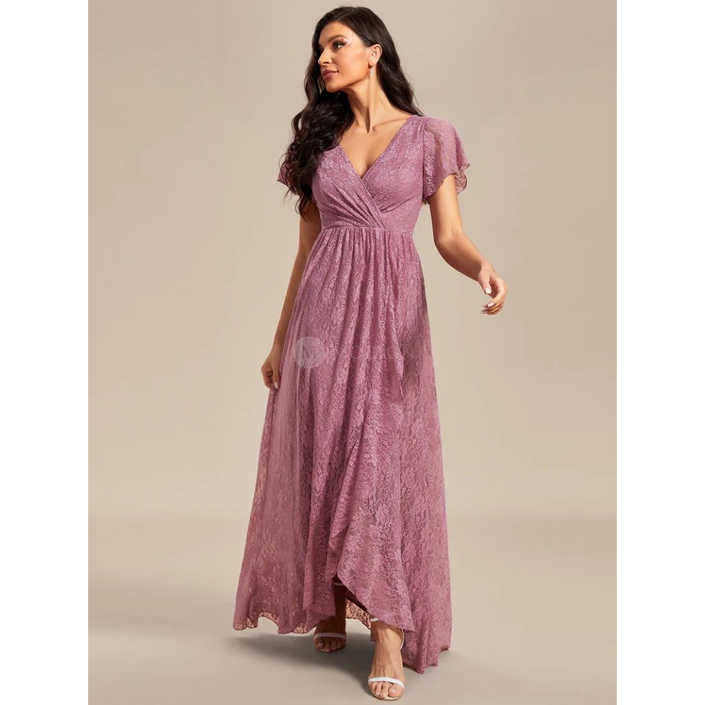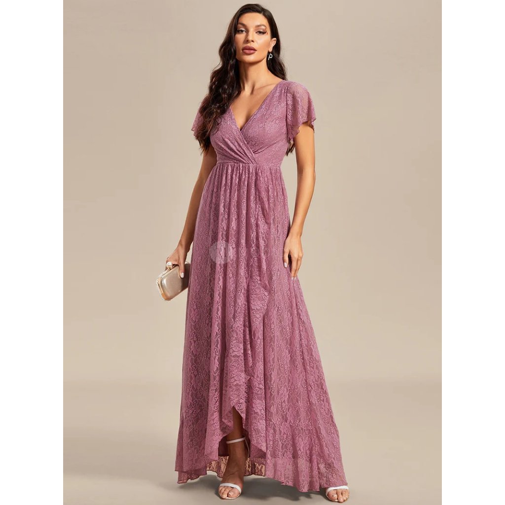 Společenské krajkové šaty ve starorůžové barvě spojují romantiku a eleganci v jednom modelu. Mírně poddajný materiál se příjemně přizpůsobí postavě, zatímco květinová krajka dodává na jemnosti a slavnostním vzhledu. Asymetrický střih s midi délkou vpředu a prodlouženou zadní částí působí moderně a zároveň lichotí ženské siluetě. Výstřih do V krásně zvýrazňuje dekolt, krátký rukáv poskytuje decentní zakrytí paží. Tyto večerní šaty jsou ideální volbou na svatbu, ples, galavečer i další společenské události.