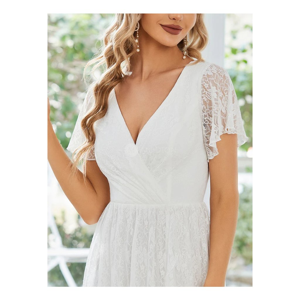 Společenské šaty Adeline: Bílé krajkové midi šaty s výstřihem do V a rukávy na svatbu i slavnost.