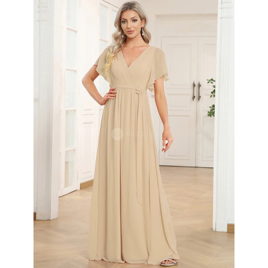 Dlouhé béžové společenské šaty z lehkého šifonu působí jemně, přirozeně a velmi elegantně. Neutrální béžový odstín dodává modelu nadčasový charakter, lehkost a univerzální využití, díky čemuž jsou šaty ideální volbou pro slavnostní události, společenské příležitosti i letní večery.