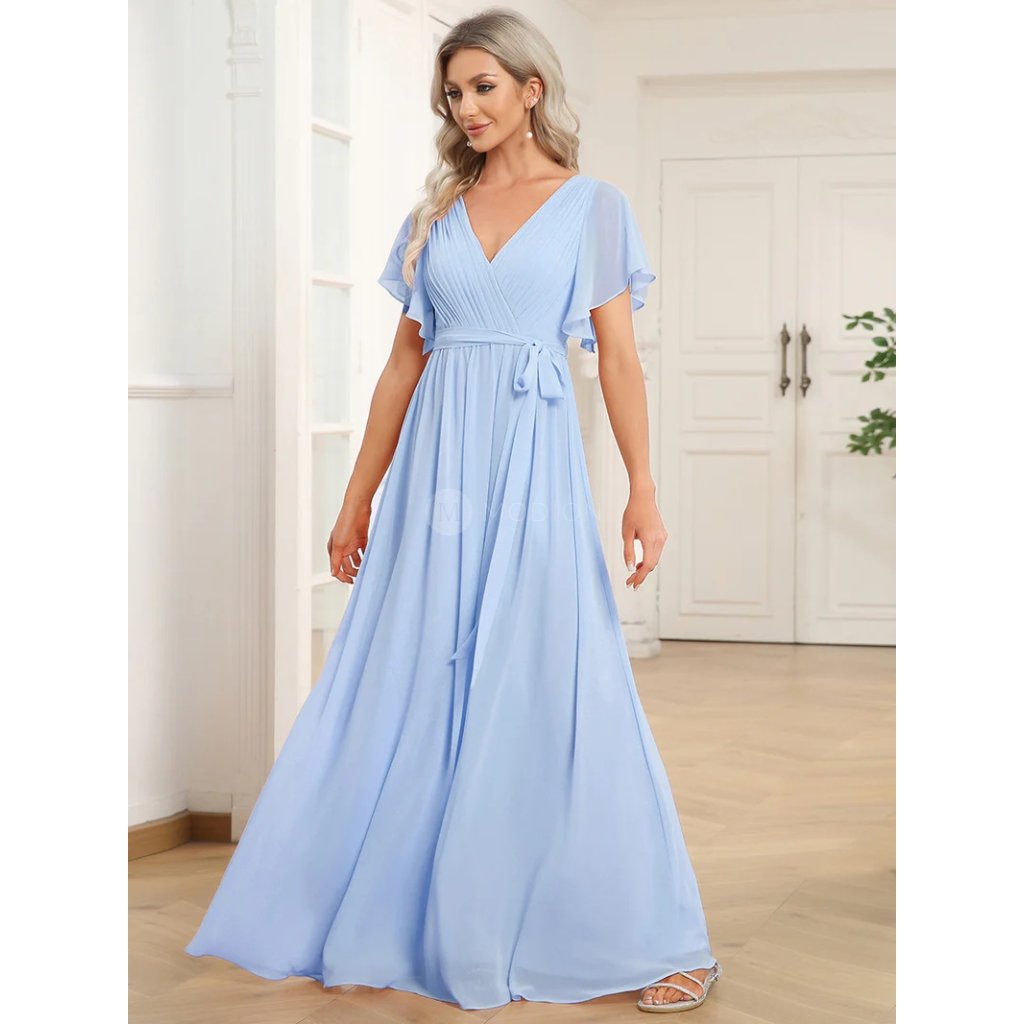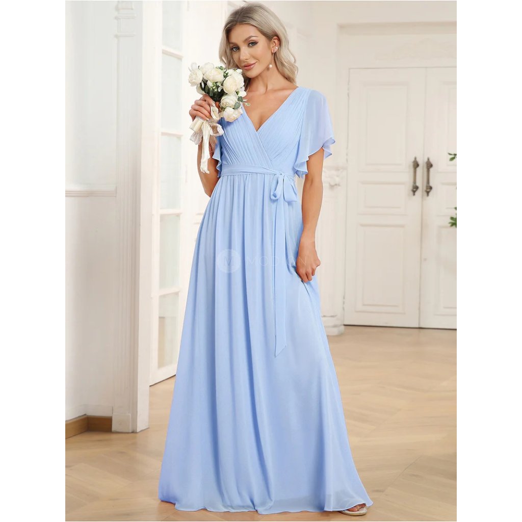 Dlouhé ledově modré společenské šaty z lehkého šifonu působí jemně, čistě a velmi elegantně. Světlý ledově modrý odstín dodává modelu svěžest, lehkost a sofistikovaný, až éterický vzhled, díky čemuž jsou šaty ideální volbou pro slavnostní události, společenské příležitosti i letní večery.