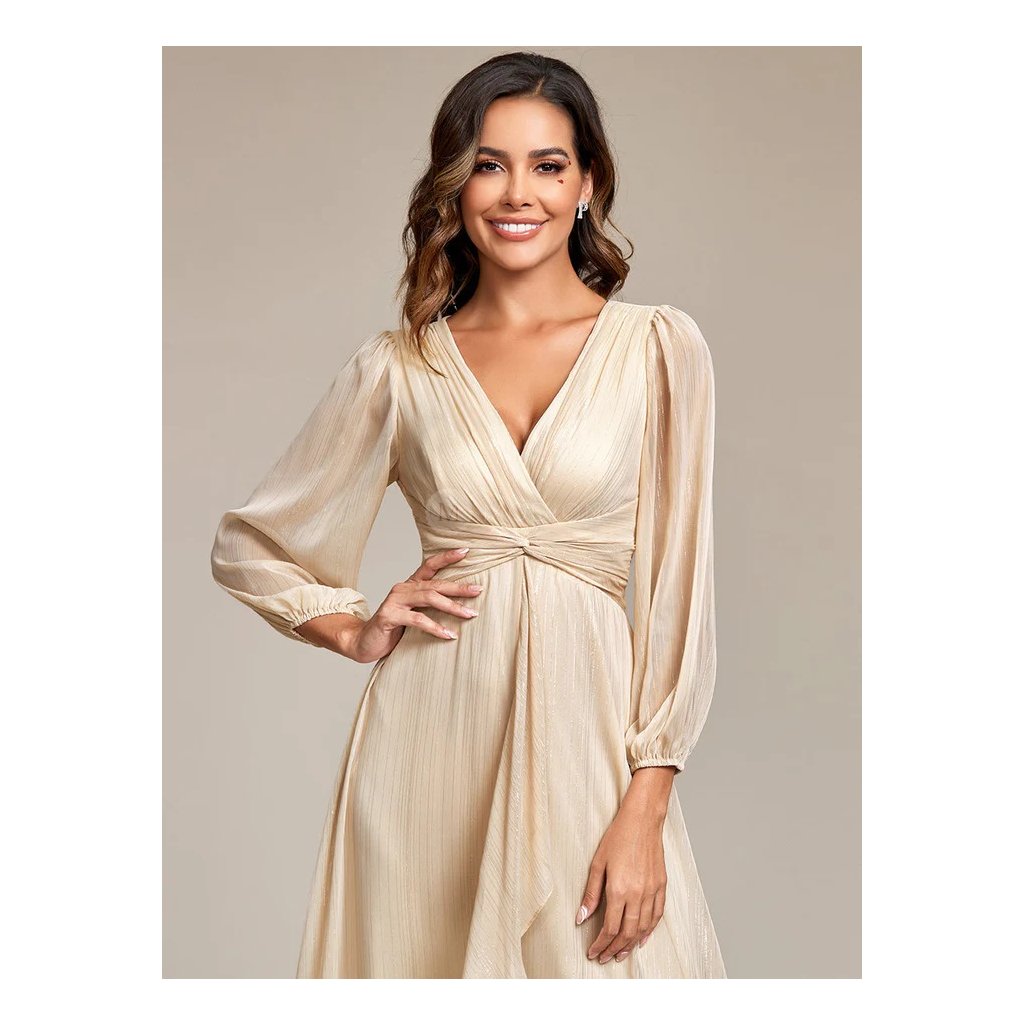 Krémové společenské šaty okouzlí svou jemností a lehkostí. Třpytivý šifon protkaný lurexovou nití dodává modelu luxusní efekt, zatímco výstřih do V s elegantním průpletem a spuštěným volánem působí vznešeně. Dlouhé rukávy poskytují pohodlí a zároveň umocňují slavnostní charakter šatů. Áčkový střih rozšířený pod prsy lichotí postavě a vytváří ladně splývavou linii.