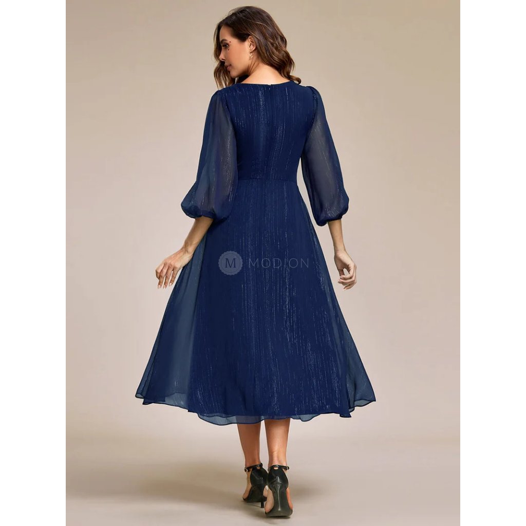 Midi tmavě modré společenské šaty působí elegantně, slavnostně a nadčasově. Jsou ideální volbou pro ženy, které hledají výraznější večerní model s jemným metalickým leskem a klasickým, lichotivým střihem.