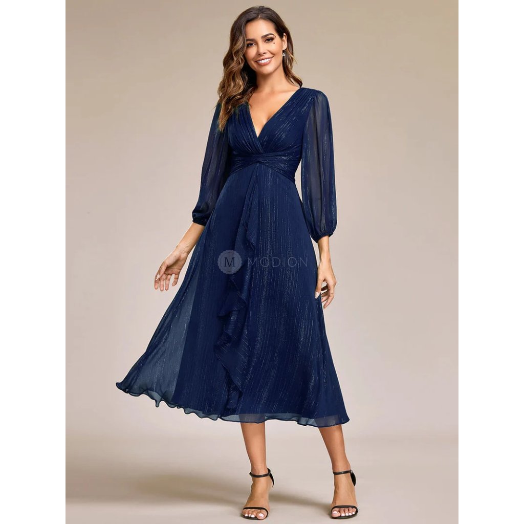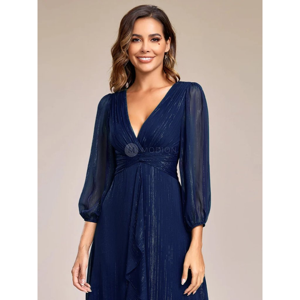 Lehký splývavý materiál s decentním třpytem dodává šatům vzdušnost a krásný pohyb při chůzi i tanci. Véčkový výstřih lichotí dekoltu a opticky prodlužuje siluetu, zatímco dlouhé rukávy působí elegantně a vyváženě. Řasený pas zvýrazňuje ženské linie a vytváří harmonickou siluetu. Celkový vzhled je kultivovaný, reprezentativní a velmi univerzální pro slavnostní příležitosti.