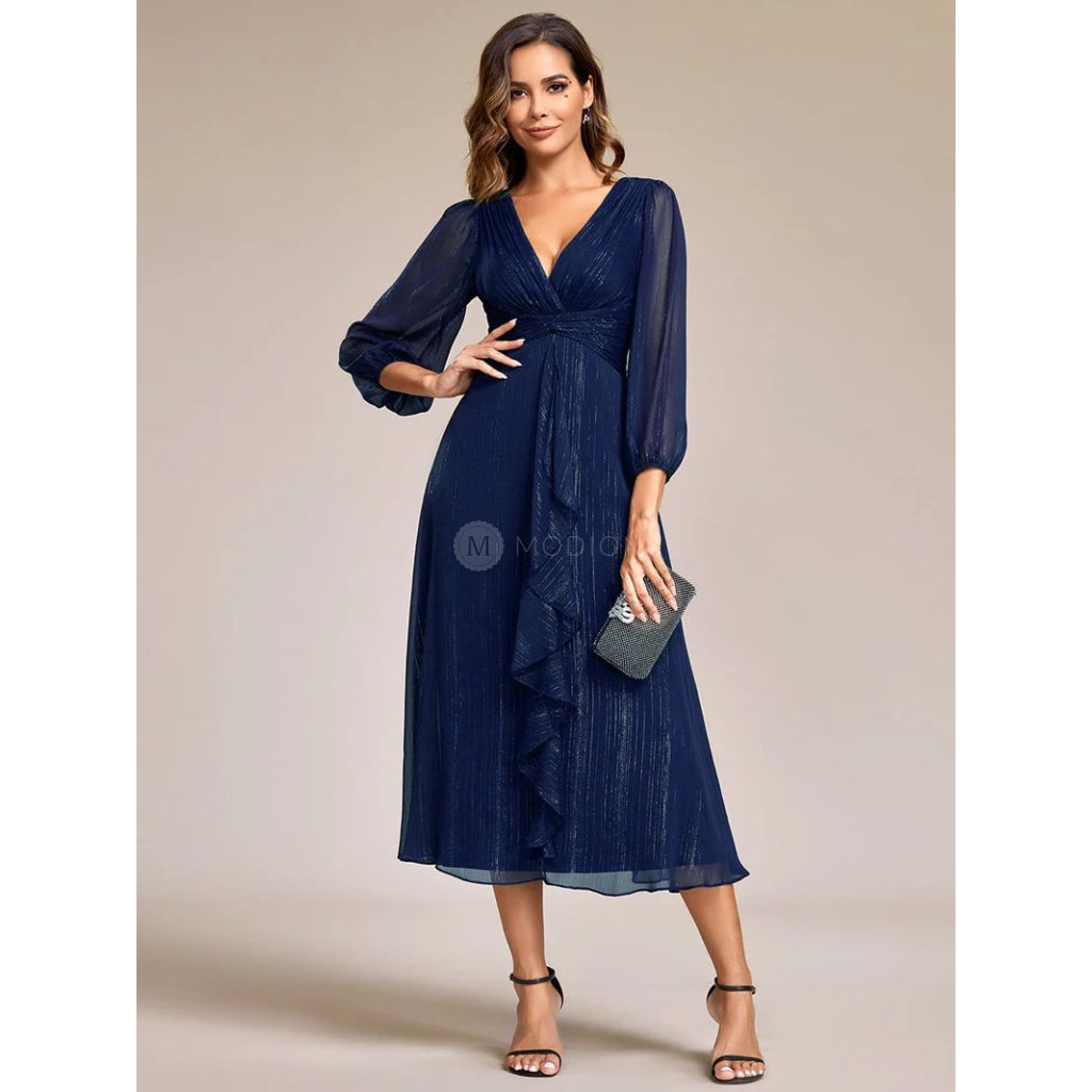 Tmavě modré společenské šaty působí slavnostně a nadčasově. Lehký šifon protkaný třpytivou nití dodává šatům luxusní jiskru, zatímco výstřih do V s elegantním průpletem a spuštěným volánem zvýrazňuje ženskost. Dlouhé rukávy podtrhují jemnost střihu a áčkový střih rozšířený pod prsy lichotí postavě.