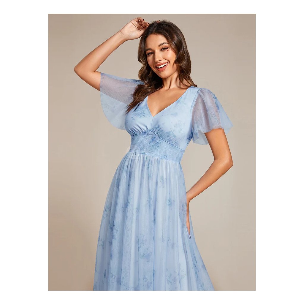 Okouzlující společenské šaty s něžným květinovým vzorem a nadýchanou áčkovou tylovou sukní, která zaručuje pohodlí po celý večer. Elastický žabičkový pas perfektně přilne a krátké tylové rukávy dodávají šatům lehkost a vílí půvab. Ideální volba na svatby, plesy, maturity i elegantní večírky.