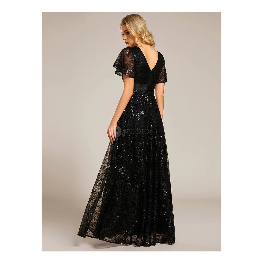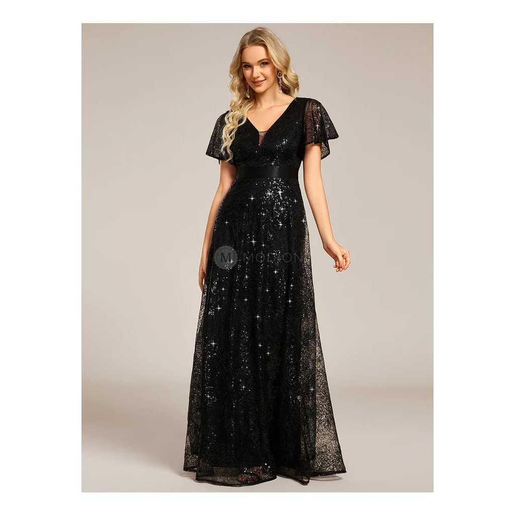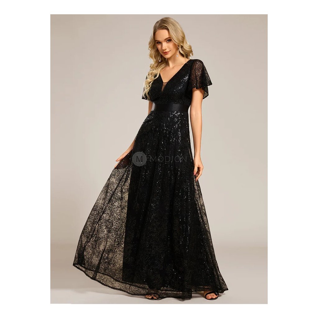 Černé společenské šaty působí elegantně, sebevědomě a zároveň nadčasově. Lehký tyl je zdoben třpytivým flitrovým vzorem, který šatům dodává decentní lesk a slavnostní nádech. Výstřih do V s jemnou průhlednou vsadkou mezi prsy vytváří jemně odhalený, ale stále důstojný dekolt. Krátké rukávy a všitý pásek zvýrazňují siluetu.