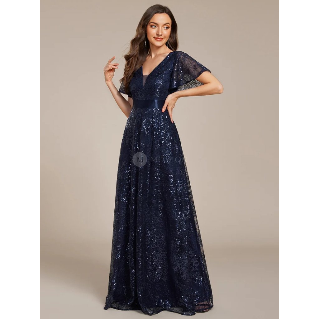 Luxusní třpytivý povrch dodává šatům výrazný lesk, který krásně vyniká při pohybu i večerním osvětlení. Výstřih do V opticky prodlužuje siluetu a zvýrazňuje dekolt, zatímco krátké rukávy z jemného materiálu přinášejí lehkost a zachovávají elegantní rovnováhu celého modelu. Dlouhá splývavá sukně vytváří ladný pohyb a podtrhuje slavnostní a večerní charakter šatů. Mírně poddajný materiál zajišťuje pohodlné nošení i během delších společenských akcí. Celkový dojem je sebevědomý, sofistikovaný a velmi efektní.