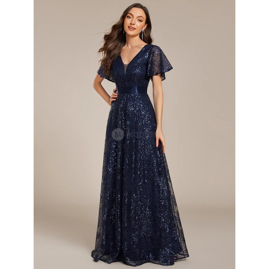 Luxusní třpytivý povrch dodává šatům výrazný lesk, který krásně vyniká při pohybu i večerním osvětlení. Výstřih do V opticky prodlužuje siluetu a zvýrazňuje dekolt, zatímco krátké rukávy z jemného materiálu přinášejí lehkost a zachovávají elegantní rovnováhu celého modelu. Dlouhá splývavá sukně vytváří ladný pohyb a podtrhuje slavnostní a večerní charakter šatů. Mírně poddajný materiál zajišťuje pohodlné nošení i během delších společenských akcí. Celkový dojem je sebevědomý, sofistikovaný a velmi efektní.