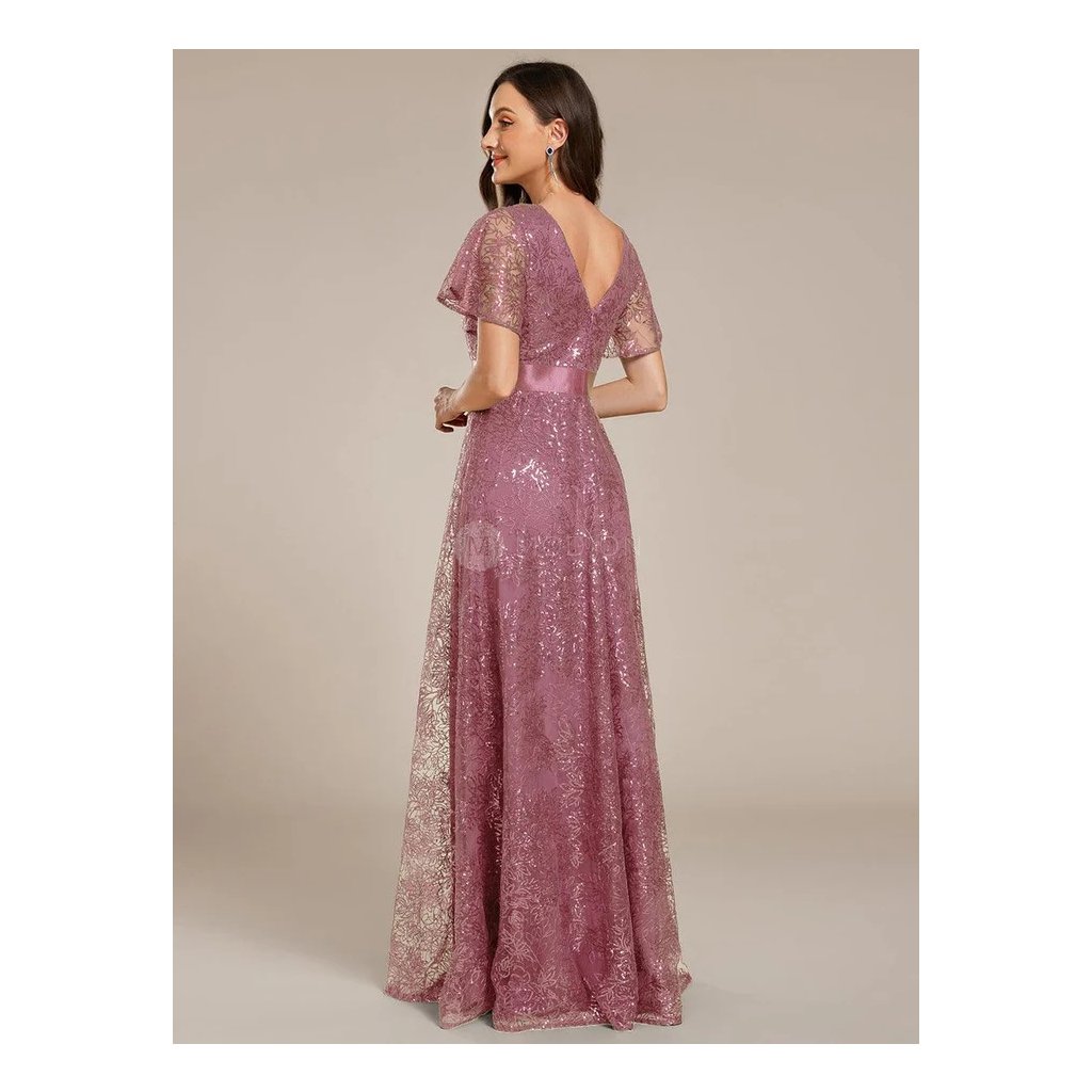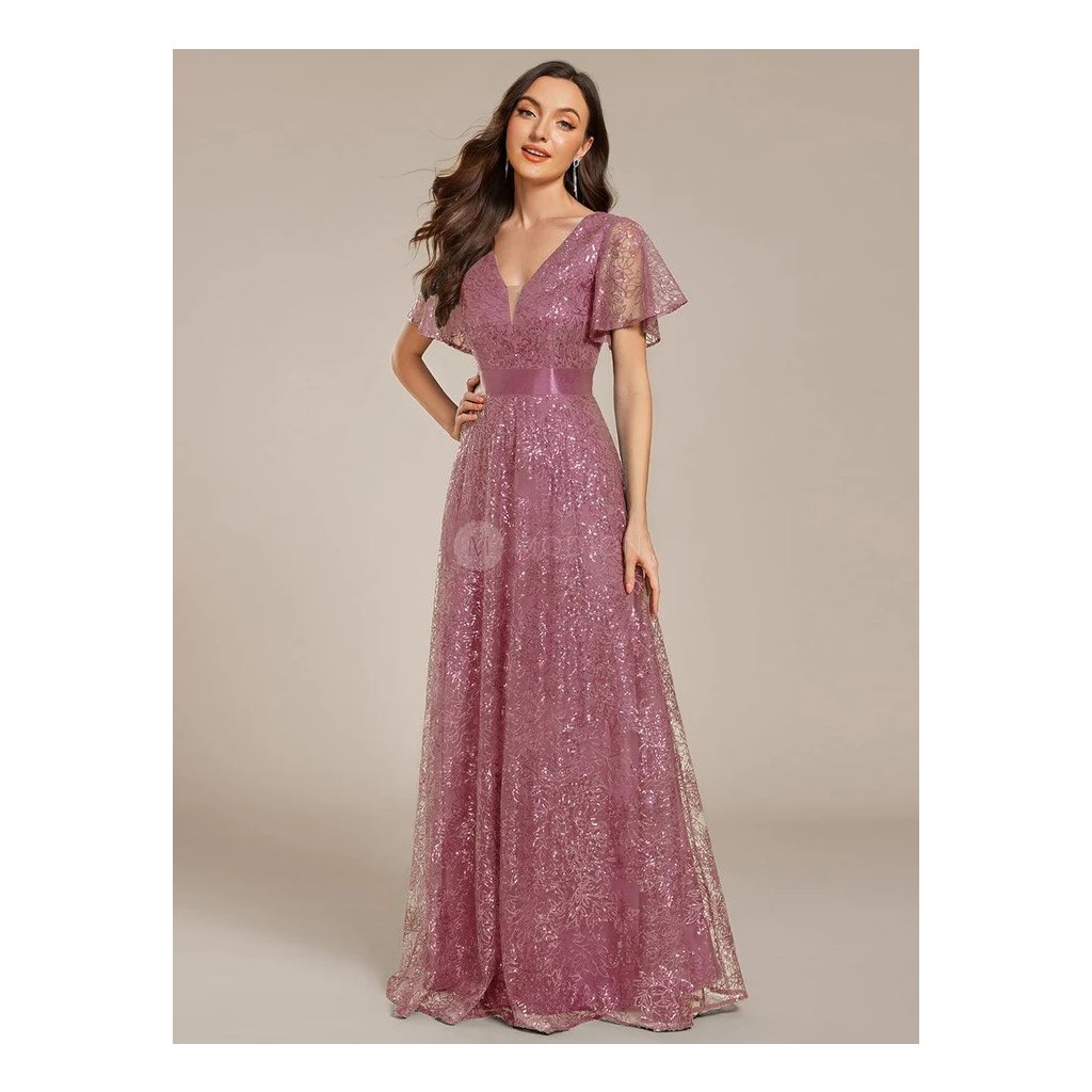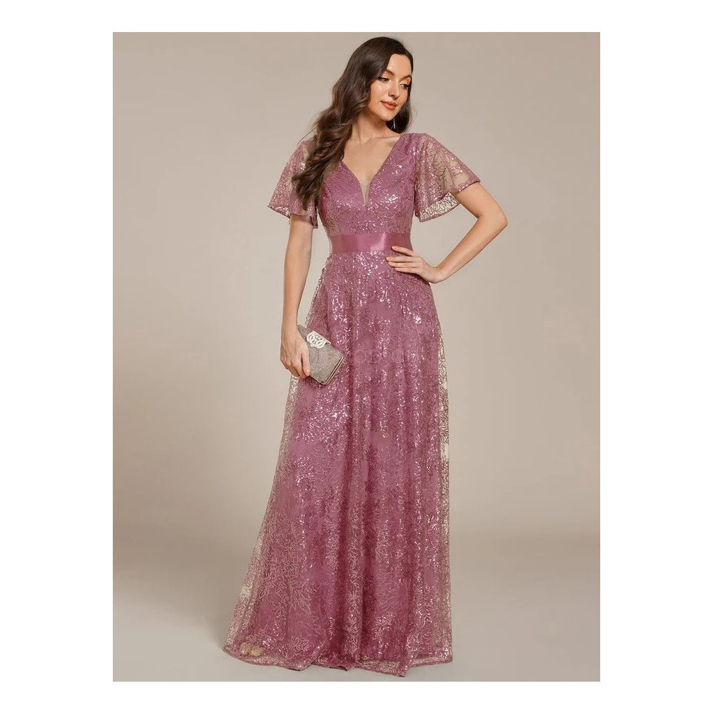 Celotřpytivá struktura materiálu vytváří decentní lesk, který krásně vynikne při večerním osvětlení. Véčkový výstřih zvýrazňuje dekolt a opticky prodlužuje postavu. Krátké rukávy z lehkého materiálu dodávají šatům vzdušnost a ženskou lehkost. Splývavá dlouhá sukně se při chůzi i tanci ladně pohybuje a podtrhuje slavnostní charakter modelu. Mírně poddajný materiál zajišťuje pohodlí a přirozené přizpůsobení postavě.