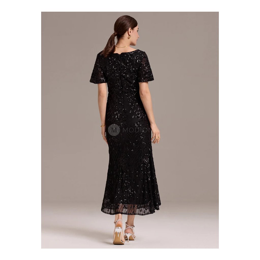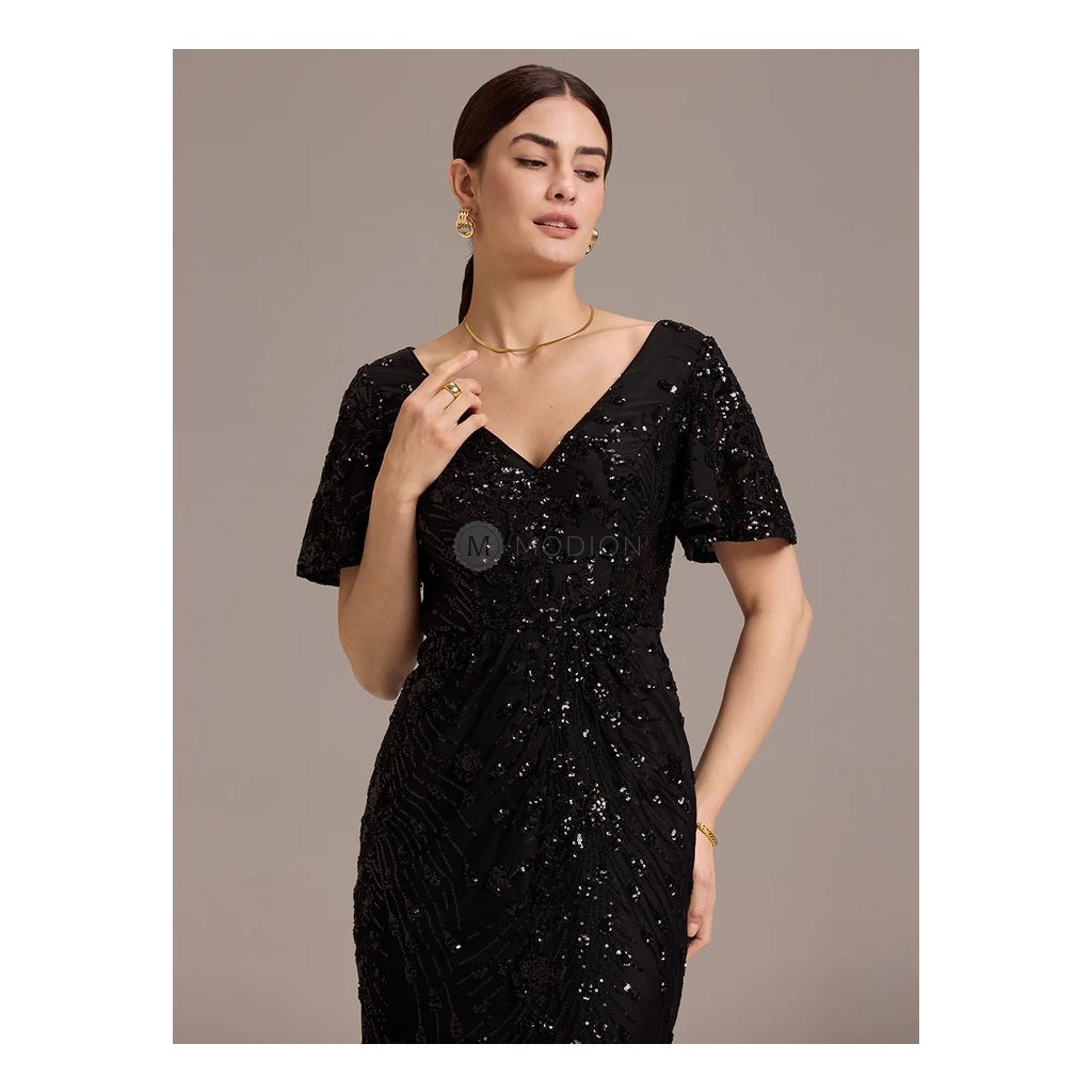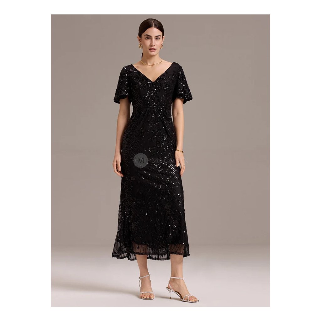 Černé společenské šaty vynikají nadčasovou elegancí a jemným flitrovým zdobením, které dodává modelu decentní třpyt bez přílišné okázalosti. Tylový základ je lehoučký a příjemný na nošení, výstřih do véčka prodlužuje krk a krátké rukávy působí decentně a vyváženě. Střih je lehce projmutý a v pase navazuje áčková sukně v midi délce, která se elegantně vlní při každém kroku.