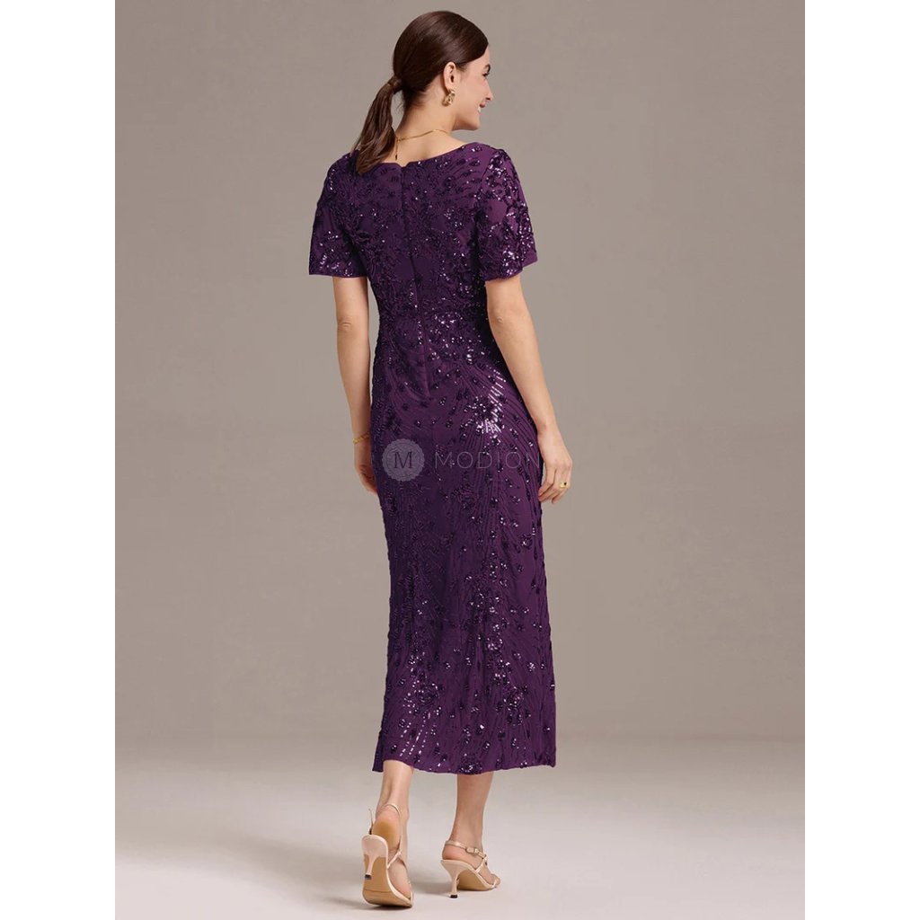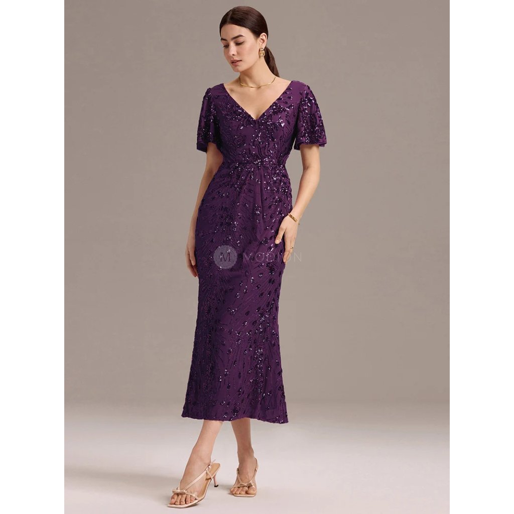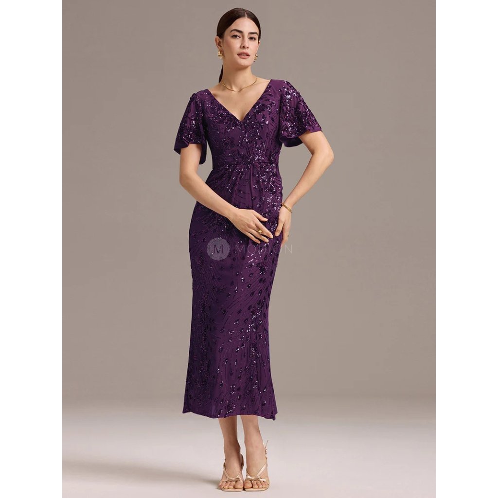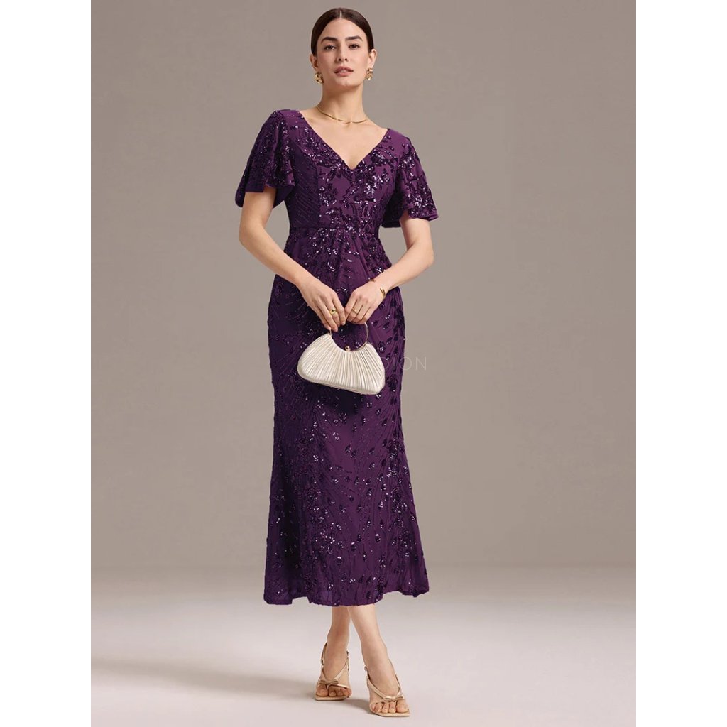 Výstřih do V působí elegantně a lichotí postavě, krátké rukávy zajišťují pohodlí a vyvážený vzhled. Horní část šatů plynule navazuje na splývavou sukni, která se při chůzi jemně vlní a vytváří ladnou, ženskou siluetu. Jemné flitrové zdobení dodává modelu decentní třpyt, aniž by celek působil okázale. Výsledný dojem je reprezentativní, vyvážený a velmi vkusný.
