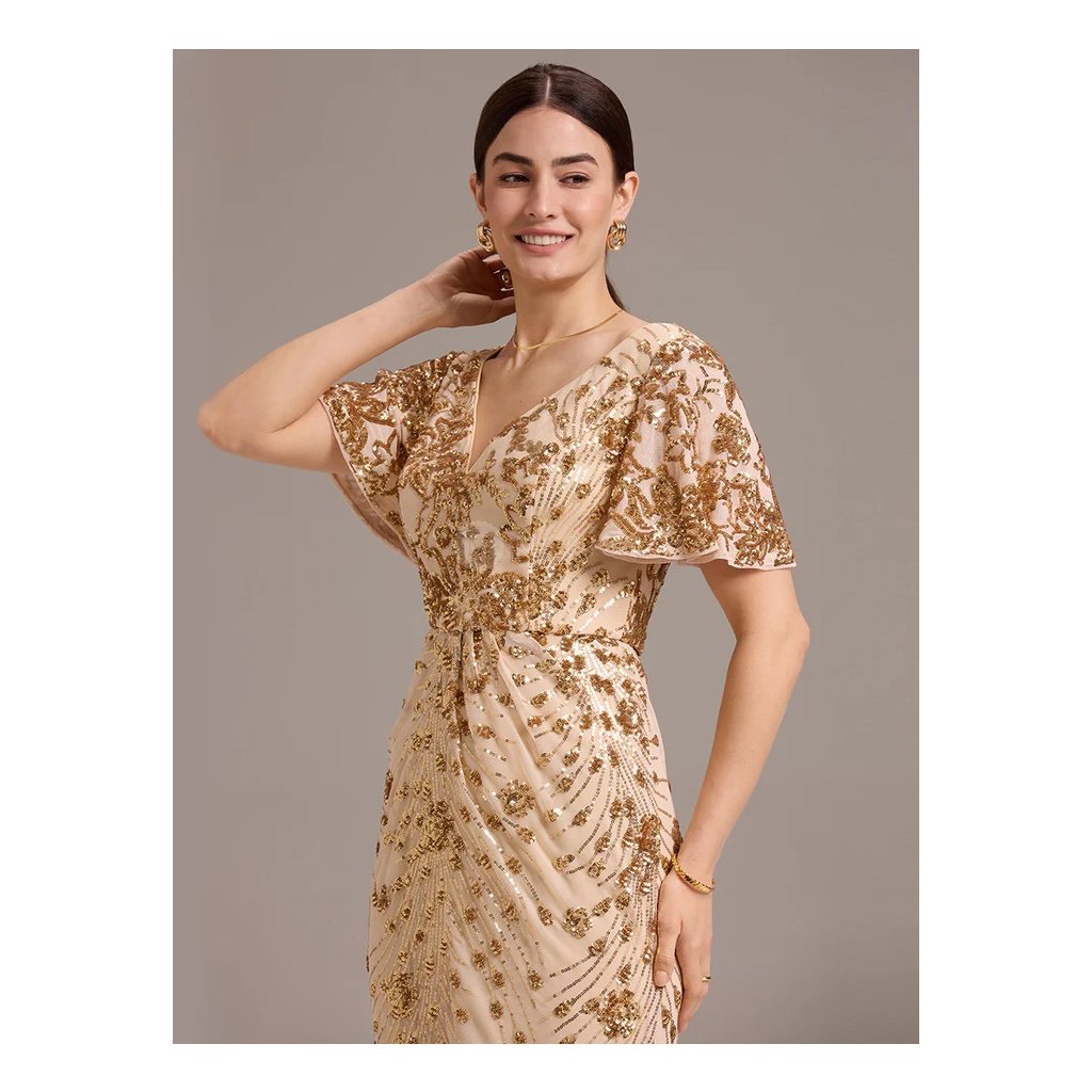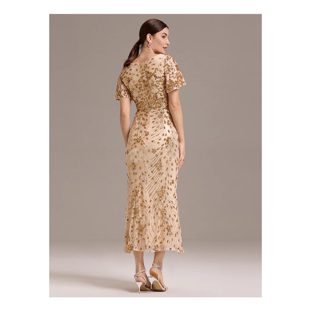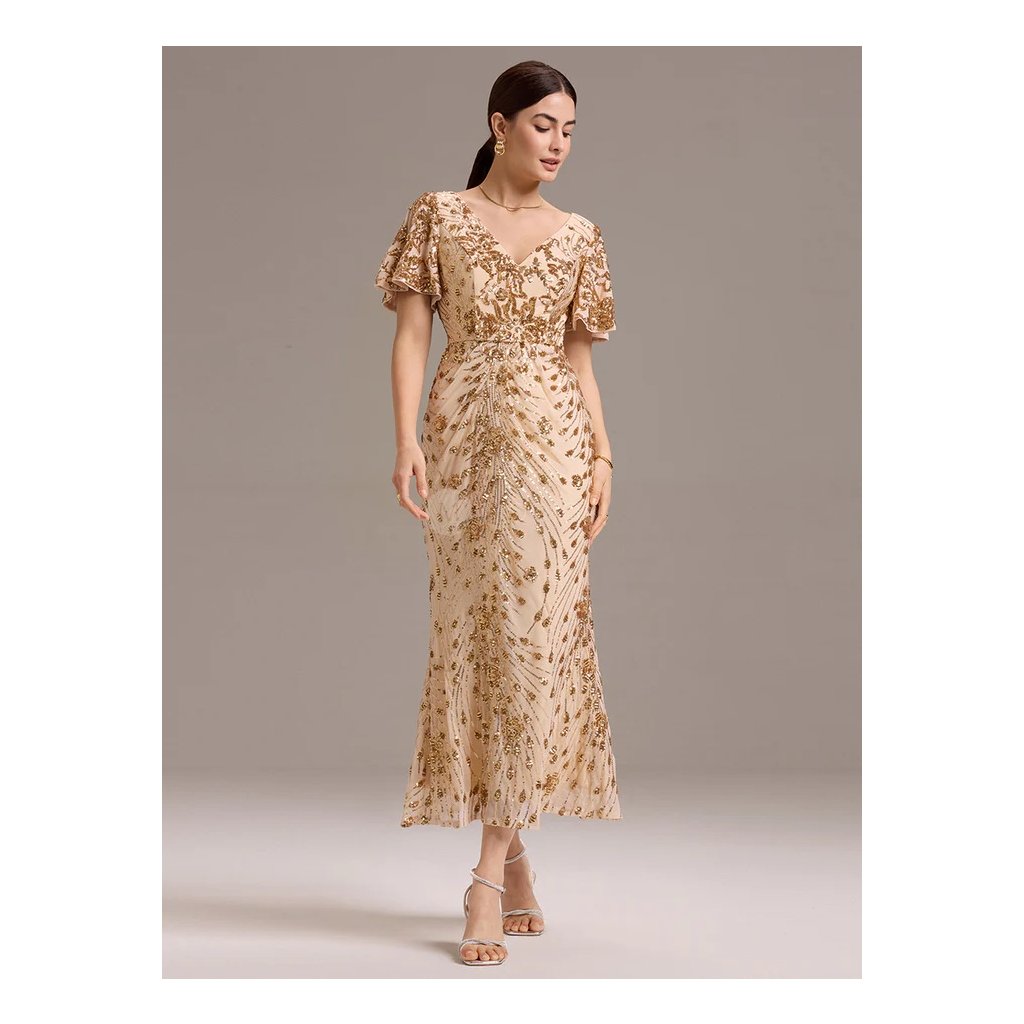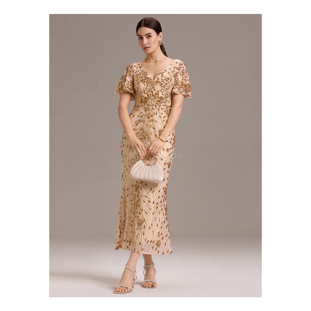 Krémové zlaté společenské šaty okouzlí slavnostním flitrovým vzorem, který krásně odráží světlo a podtrhuje celkový lesk modelu. Jemný tylový základ je zdoben ve stejném zlatém tónu, což vytváří harmonický a luxusní vzhled. Výstřih do véčka a krátké rukávy zajišťují elegantní, ale pohodlné nošení. Střih je lehce projmutý v pase a sukně v midi délce se rozšiřuje do áčka, což lichotí ženské postavě.