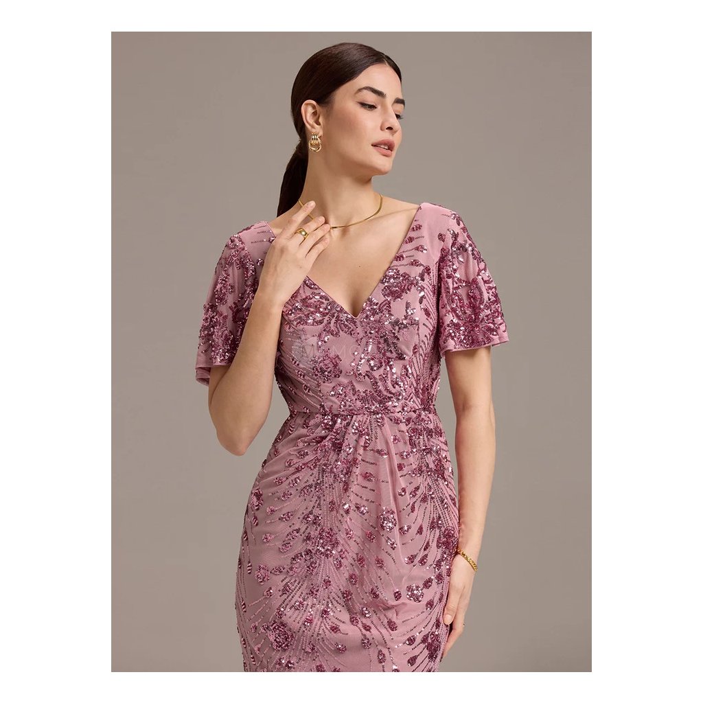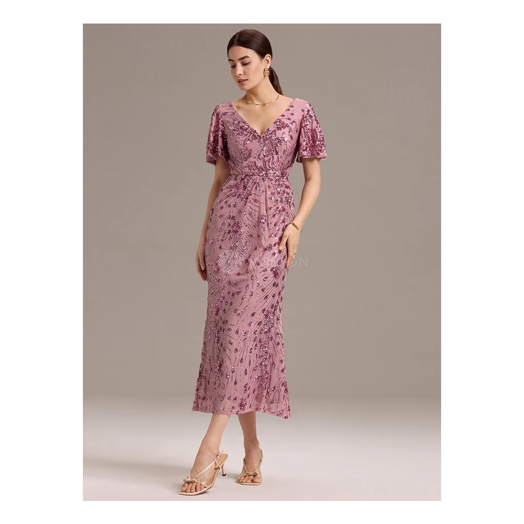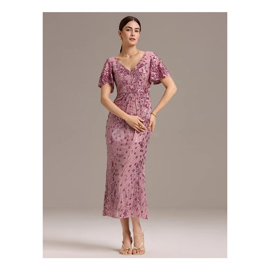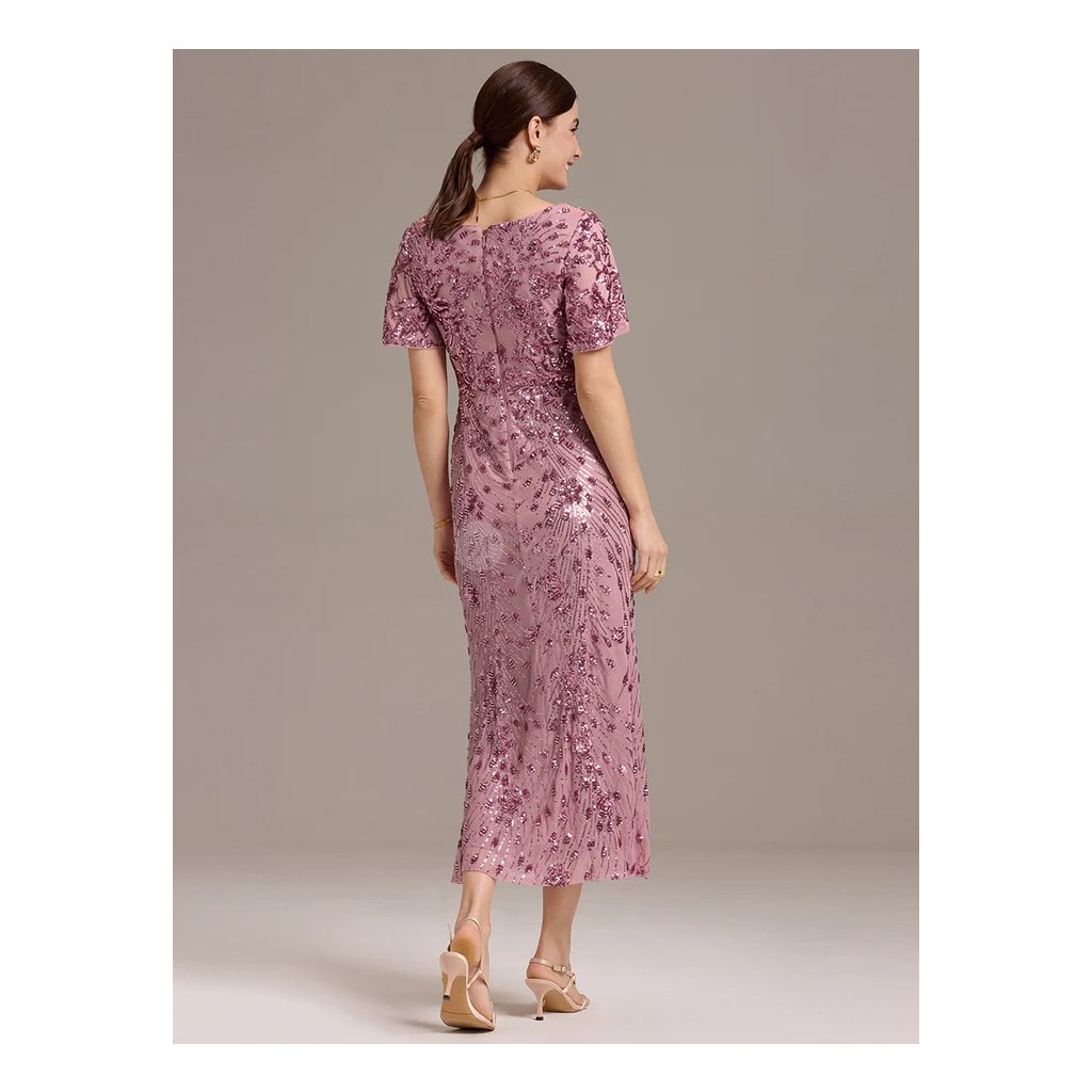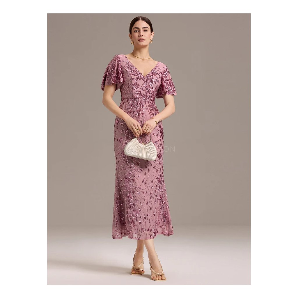 Starorůžové společenské šaty z jemného tylu s třpytivým flitrovým vzorem tón v tónu působí romanticky a něžně. Výstřih do V zvýrazňuje dekolt, krátké rukávy elegantně zakrývají ramena a lehký střih do áčka lichotí postavě. Midi délka dodává šatům šarm a univerzálnost.