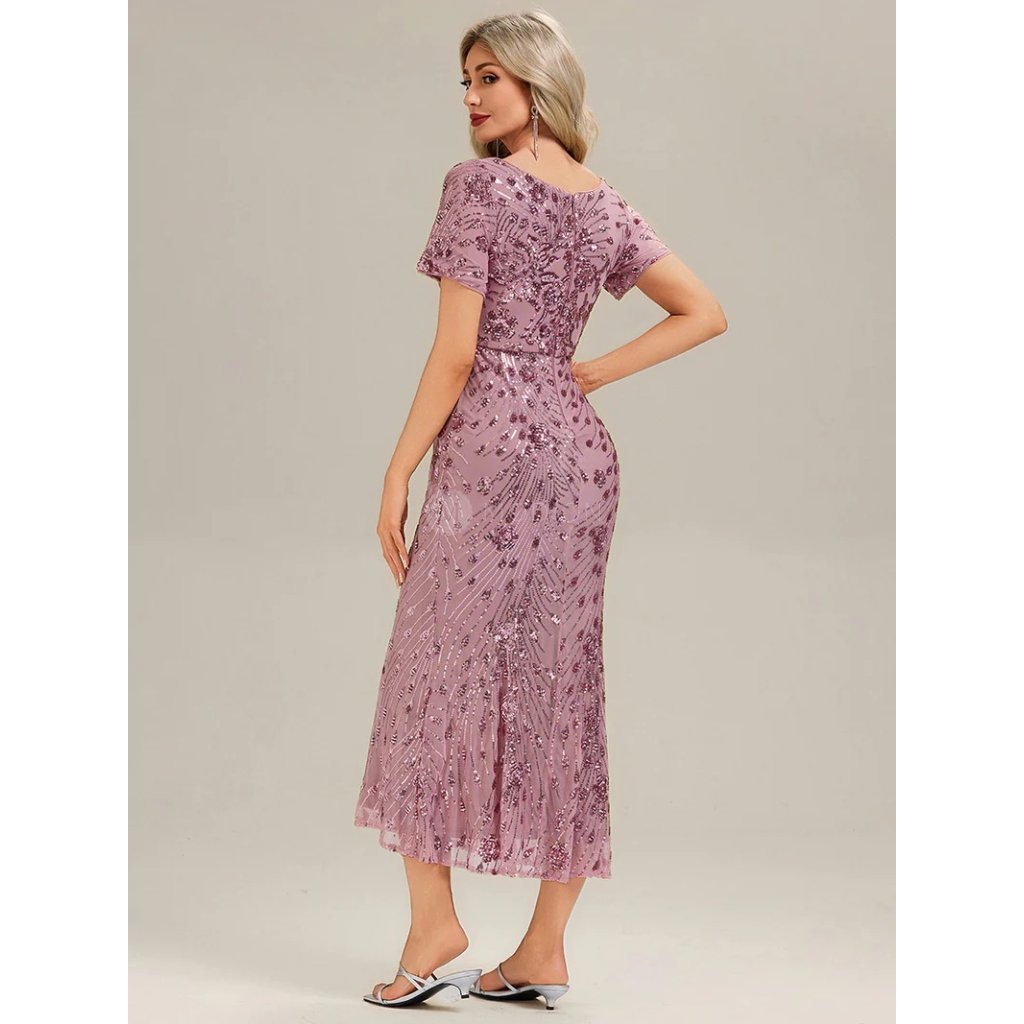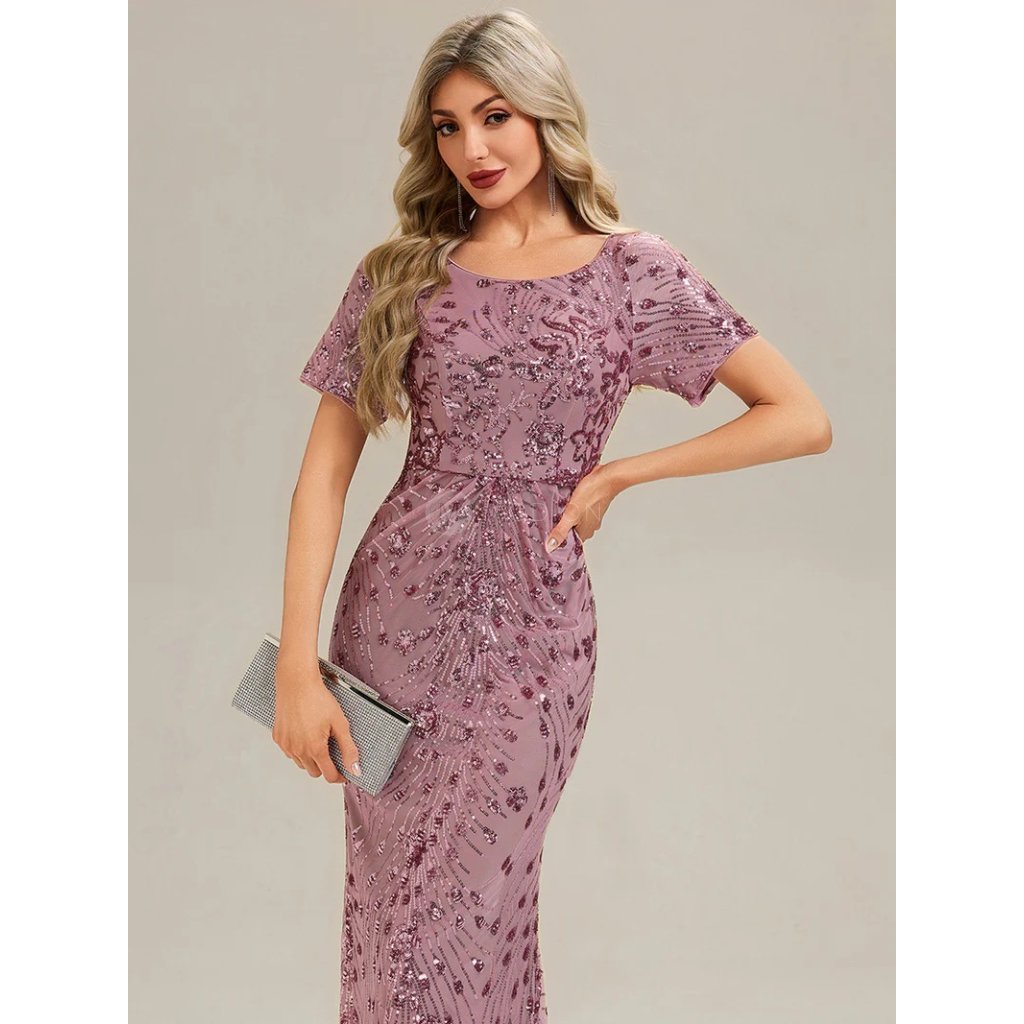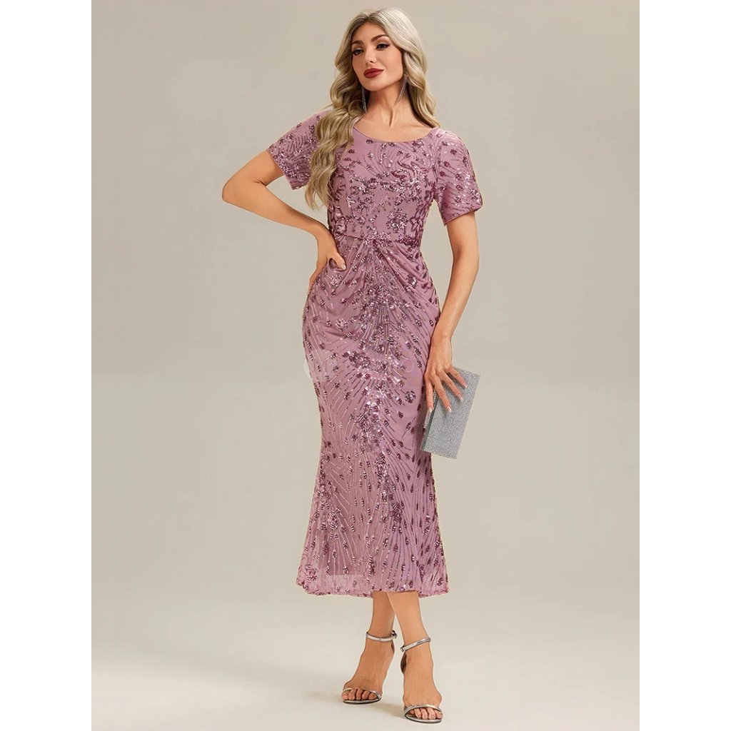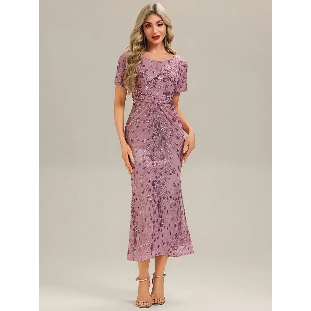 Starorůžové společenské šaty působí něžně a romanticky. Midi délka a bodycon střih krásně zvýrazňují ženské křivky, zatímco krátký rukáv a kulatý výstřih zachovávají decentní eleganci. Flitrový vzor v růžovém tónu se třpytí při každém pohybu a řasení v pase jemně zakrývá bříško. Perfektní volba na svatbu, ples, večerní slavnost i koncert.