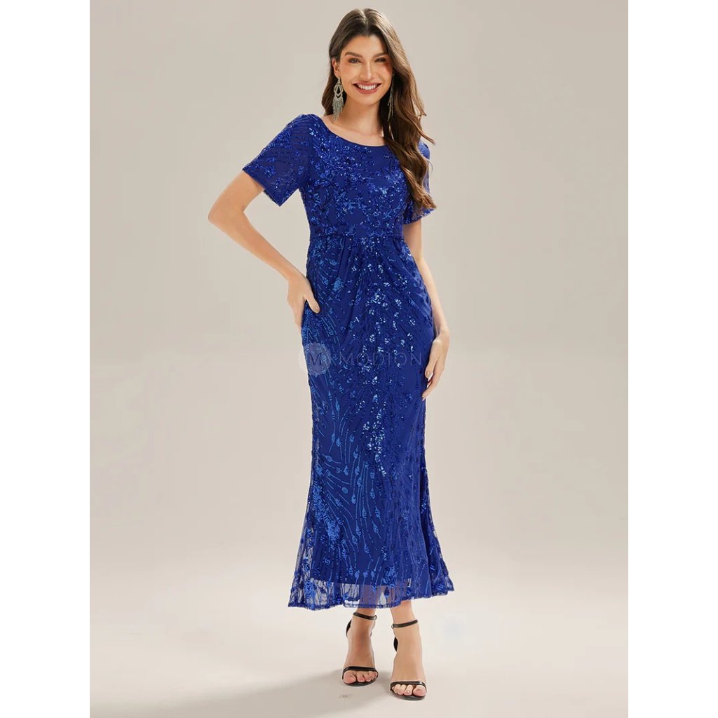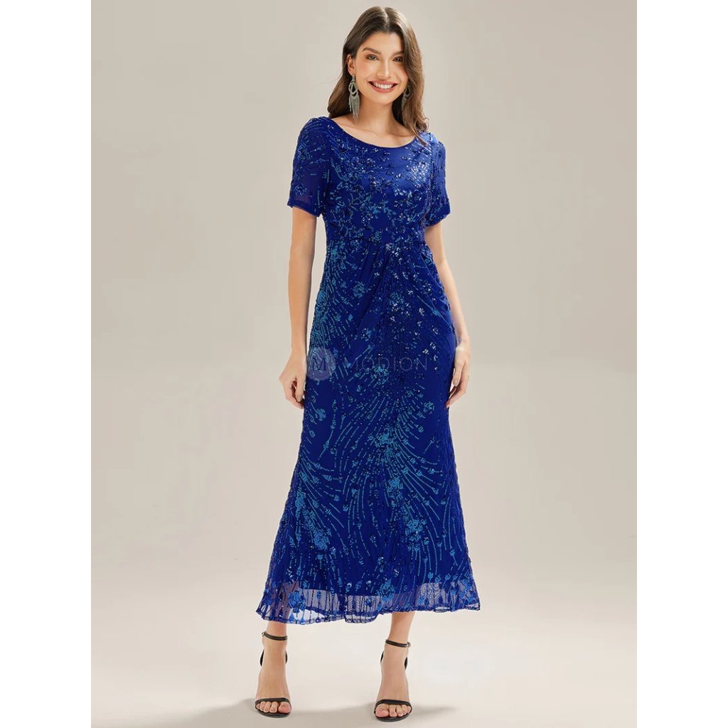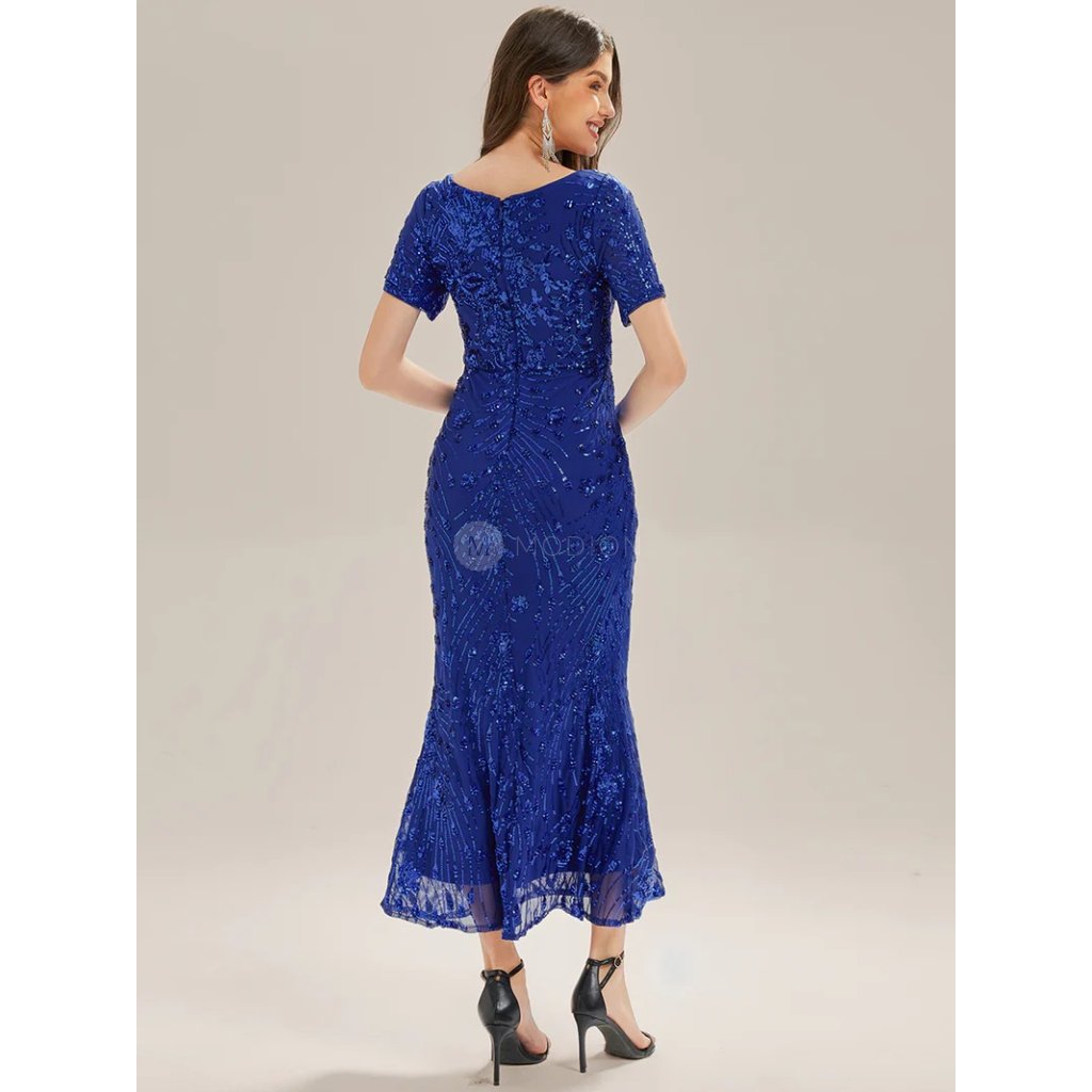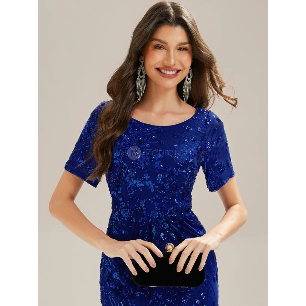 Safírové společenské šaty v midi délce jsou synonymem noblesy. Vypasovaný bodycon střih obepíná postavu, krátký rukáv a kulatý výstřih působí elegantně. Flitrové zdobení na tylovém podkladu hraje oslňujícím třpytem, který dodává šatům luxusní vzhled. Řasení v pase lichotí postavě. Ideální volba pro ples, galavečer, divadelní premiéru i svatbu.
