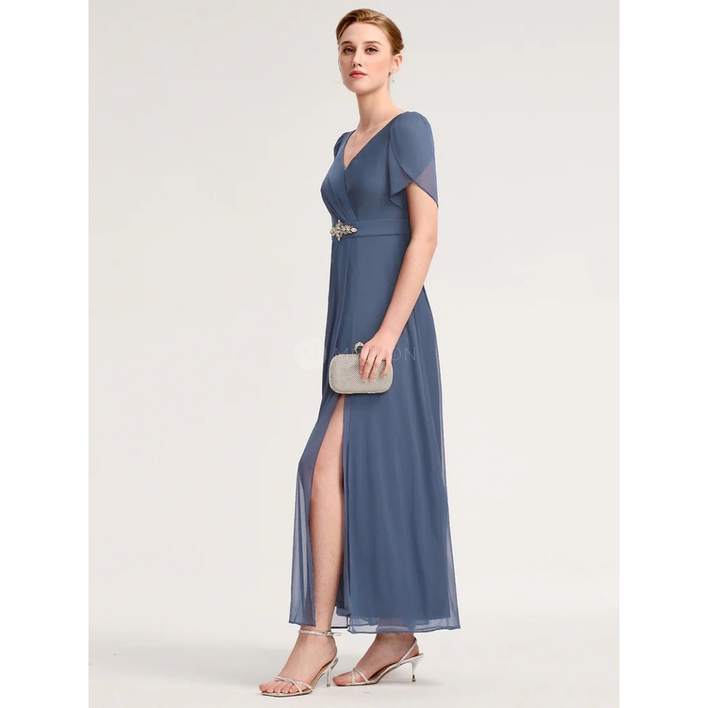 Společenské šaty Aurelia: Modrošedé dlouhé šifonové šaty s V výstřihem a rozparkem od kulturních akcí po premiéry.