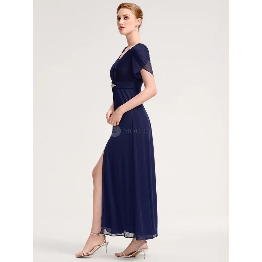 Společenské šaty tmavě modré dlouhé šifonové s rozparkem, rukávem a broží v pase – Ever Pretty EE02400NB
