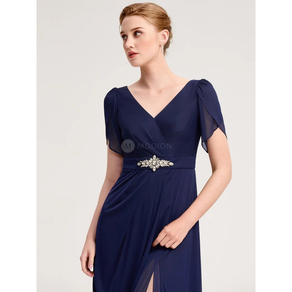 Tmavě modré společenské šaty působí elegantně a nadčasově. Výstřih do V krásně podtrhne dekolt, krátký rukáv dodává jemnou sofistikovanost a pohodlí. Pas zdobí třpytivý ornament z kamínků, který opticky zeštíhluje a přidává šatům slavnostní nádech. Dlouhá splývavá šifonová sukně s rozparkem působí při chůzi i tanci okouzlujícím dojmem. Společenské šaty jsou ideální na ples, svatbu, maturitní večírek, galavečer i rodinné oslavy.