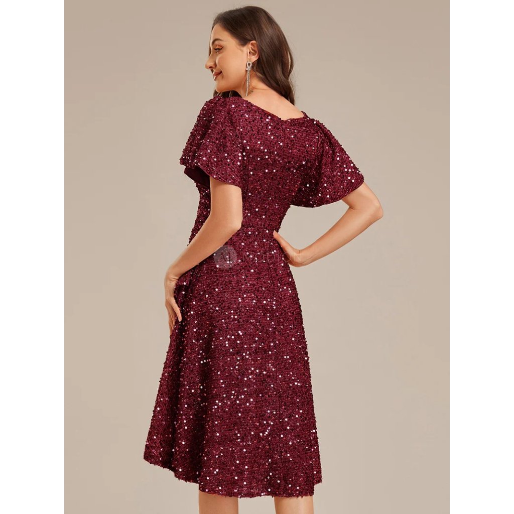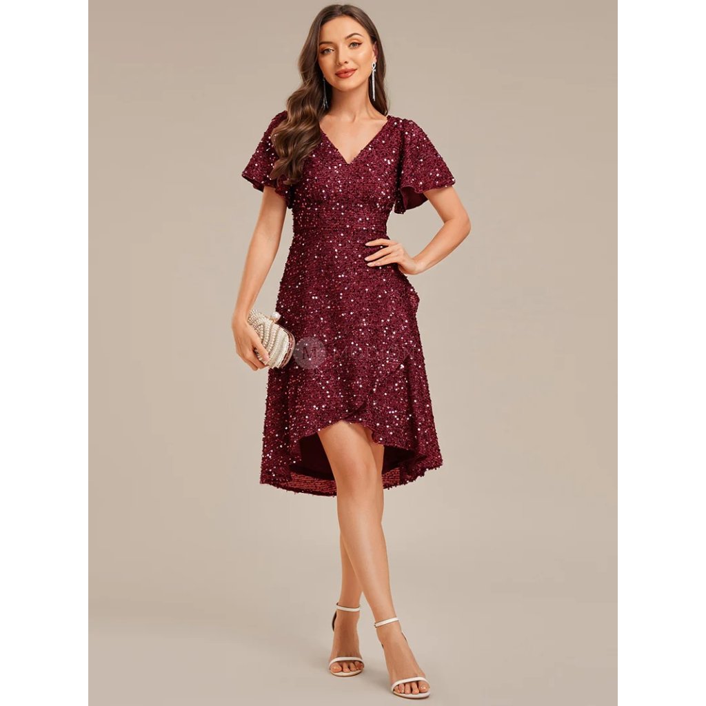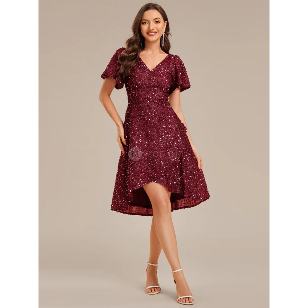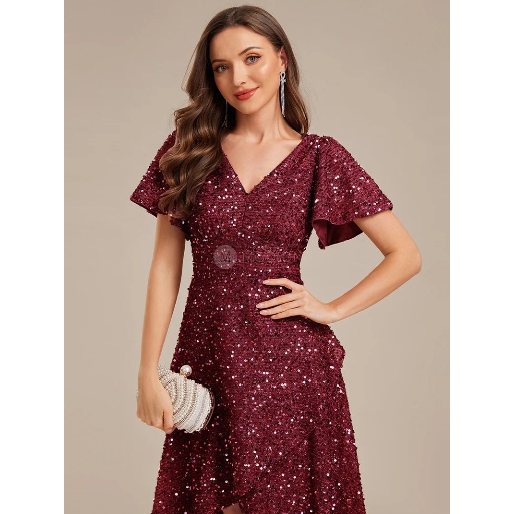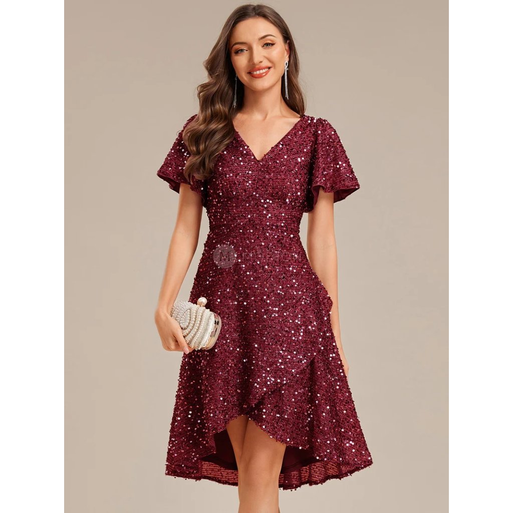 Červené vínové společenské šaty působí smyslně a zářivě. Výstřih do V zvýrazňuje dekolt, krátký rukáv je pohodlný a elegantní. Celý povrch je zdobený třpytivými flitry, které přitahují pozornost při každém pohybu. Asymetrická délka sukně opticky prodlužuje postavu a působí mladistvě. Elegantní šaty jsou vhodné na ples, svatbu, večírek, galavečer, maturitní událost i do tanečních.