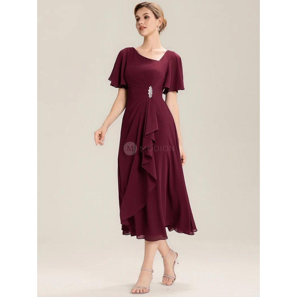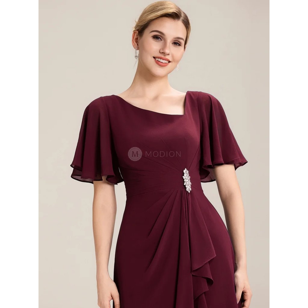 Červené vínové společenské šaty působí smyslně a elegantně. Asymetrický výstřih zvýrazňuje dekolt, krátký rukáv dodává noblesu a pohodlí. Pas zdobí štrasová ozdoba přecházející v jemné řasení, které opticky zeštíhluje postavu. Midi šifonová sukně se pohybuje s lehkostí a půvabem při každém kroku. V pase šaty lichotivě tvarují postavu a na zadním díle mají praktické žabičkování, které se přizpůsobí a zajišťuje pohodlí při nošení.
