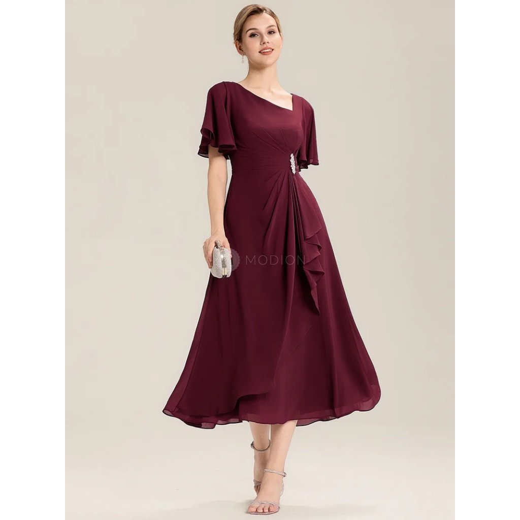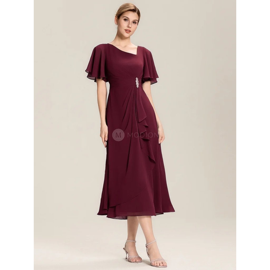 Společenské šaty Solenne: Elegantní vínové šifonové midi šaty s asymetrickým výstřihem a zdobeným pasem na ples i svatbu.