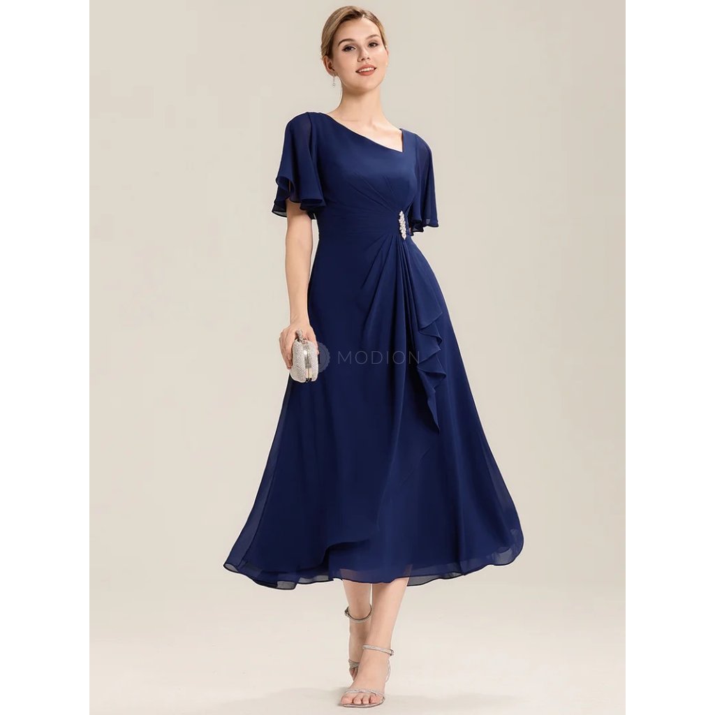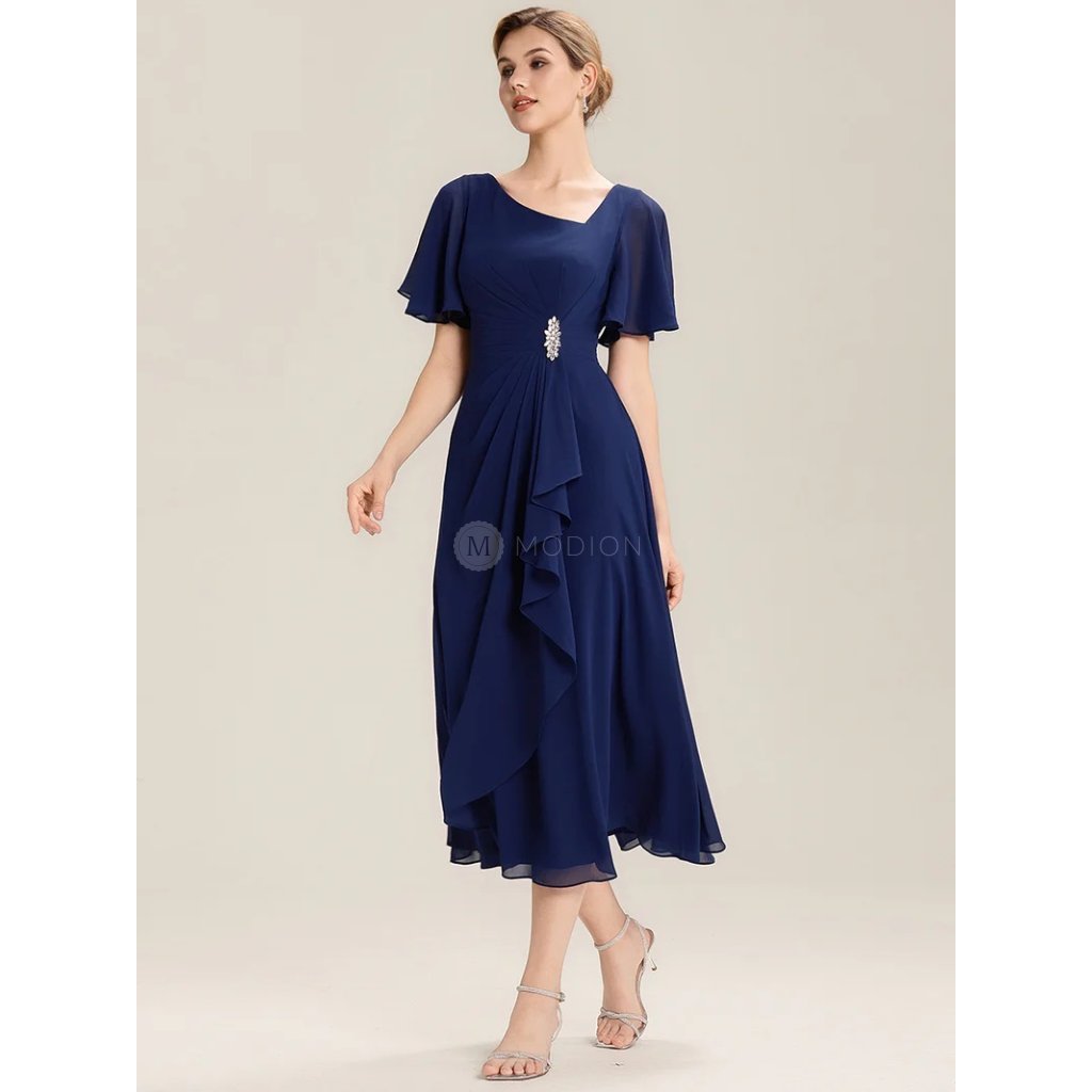 Společenské šaty Solenne: Elegantní tmavě modré šifonové midi šaty s asymetrickým výstřihem a zdobeným pasem na ples i svatbu.