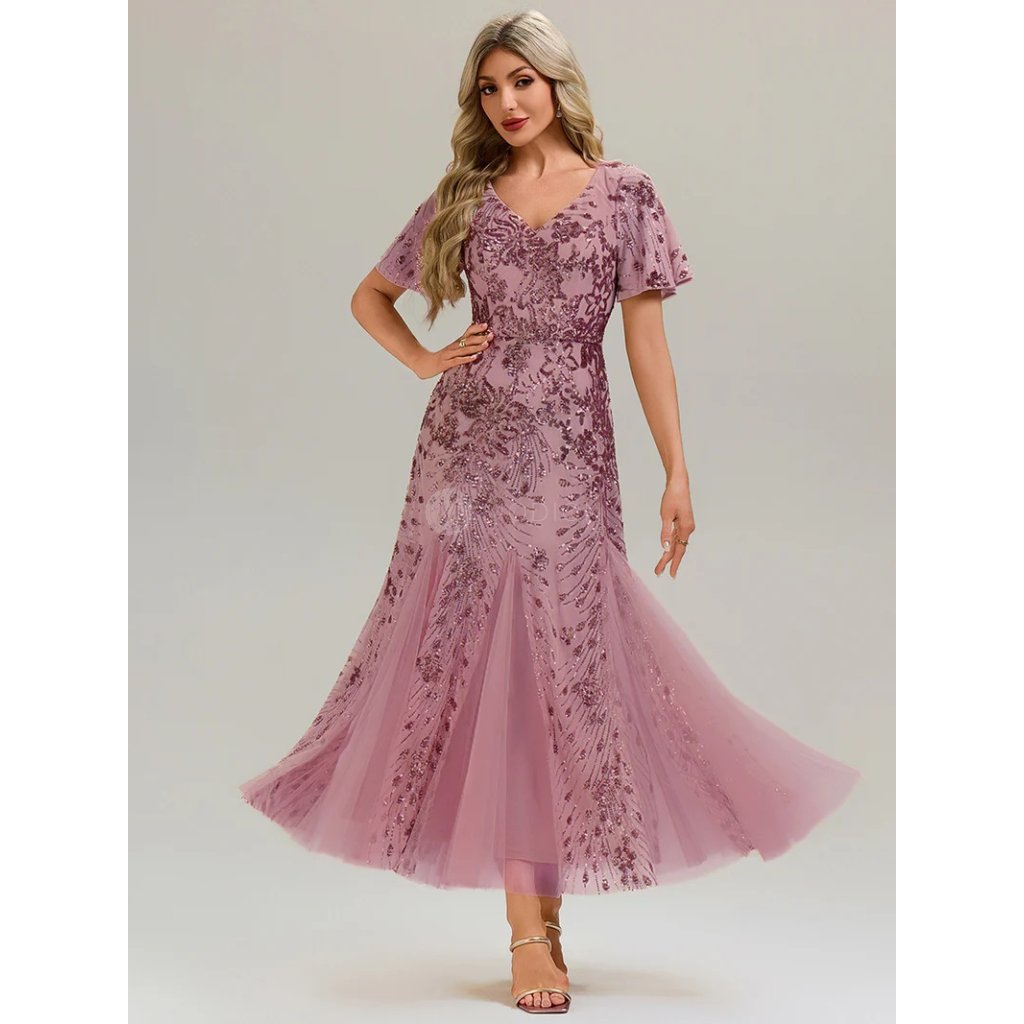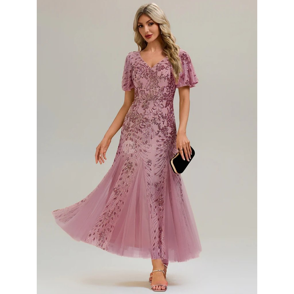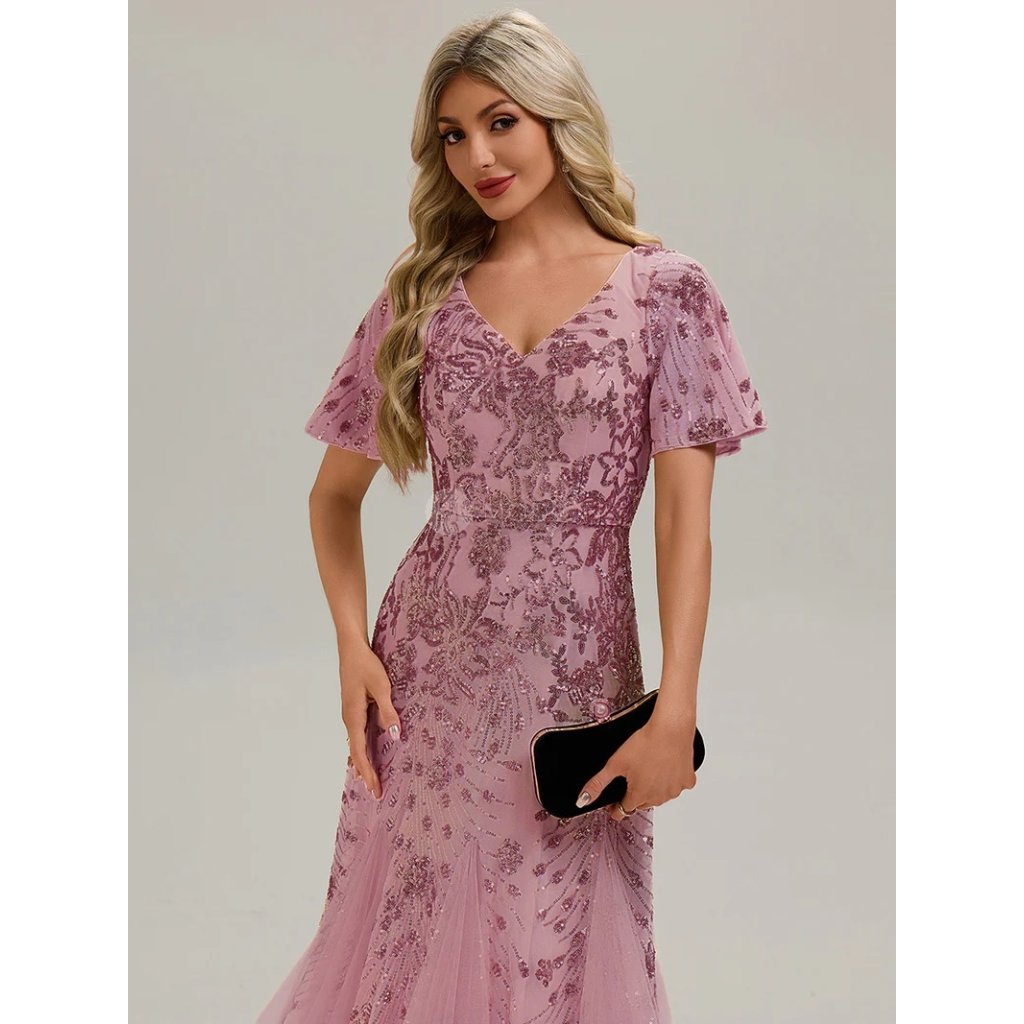 Starorůžové dlouhé společenské šaty působí jemně a romanticky. Výstřih do V podtrhuje ženské linie, krátký rukáv přidává eleganci a komfort. Tylová látka je zdobená flitrovými ornamenty, které se třpytí při každém pohybu. Dlouhá sukně působí vzdušně a elegantně, při chůzi i tanci ladně splývá. Elegantní šaty se hodí na ples, svatbu, galavečer, maturitní večírek i rodinnou oslavu.