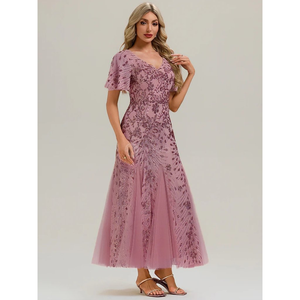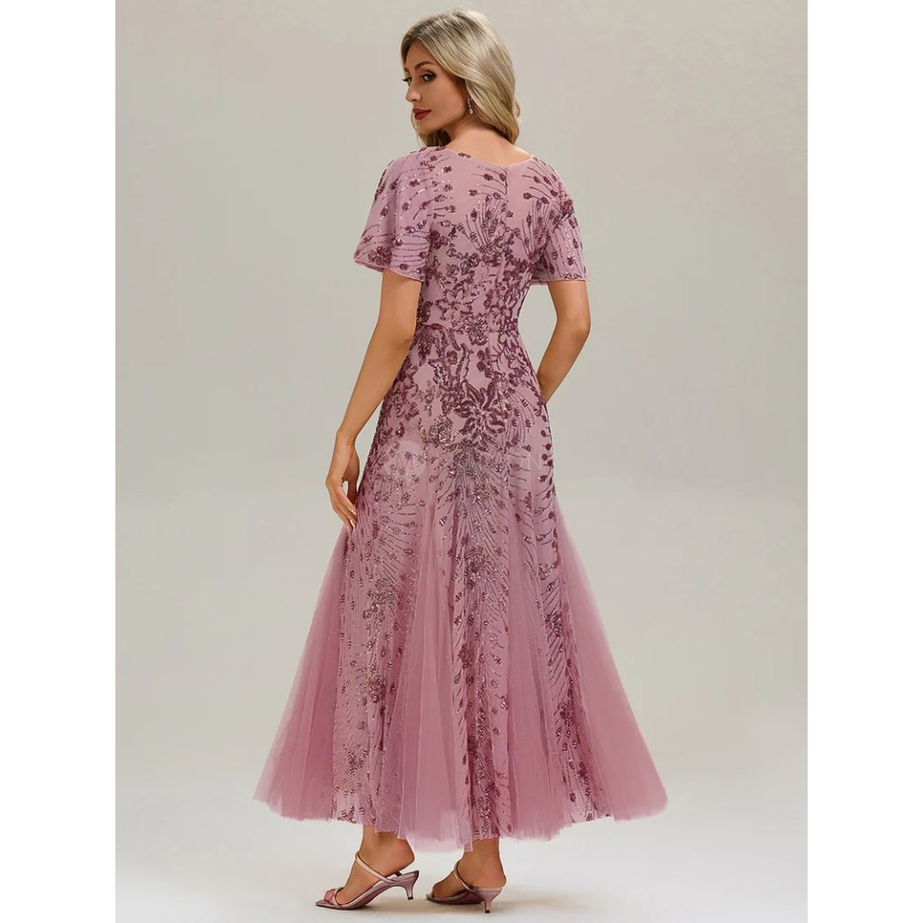 Starorůžové dlouhé společenské šaty působí jemně a romanticky. Výstřih do V podtrhuje ženské linie, krátký rukáv přidává eleganci a komfort. Tylová látka je zdobená flitrovými ornamenty, které se třpytí při každém pohybu. Dlouhá sukně působí vzdušně a elegantně, při chůzi i tanci ladně splývá. Elegantní šaty se hodí na ples, svatbu, galavečer, maturitní večírek i rodinnou oslavu.