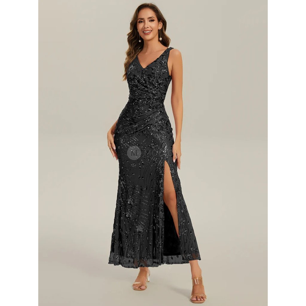 Společenské šaty Raffaella: Luxusní černé flitrové šaty s rozparkem a pohodlnými ramínky na ples i galavečer.