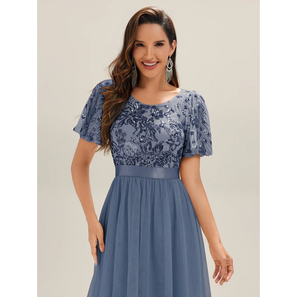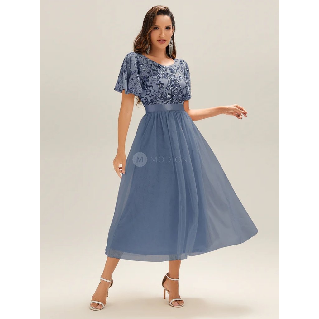 Modrošedé večerní šaty vynikají romantickým a slavnostním stylem, který se hodí na nejrůznější společenské události. Živůtek zdobí třpytivé flitry v květinovém motivu, které krásně odrážejí světlo. Krátké řasené rukávy působí jemně a dodávají šatům lehkost, zatímco zvýrazněný pas lichotivě tvaruje postavu.
