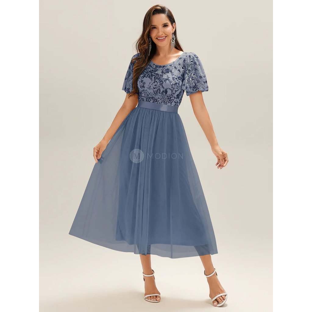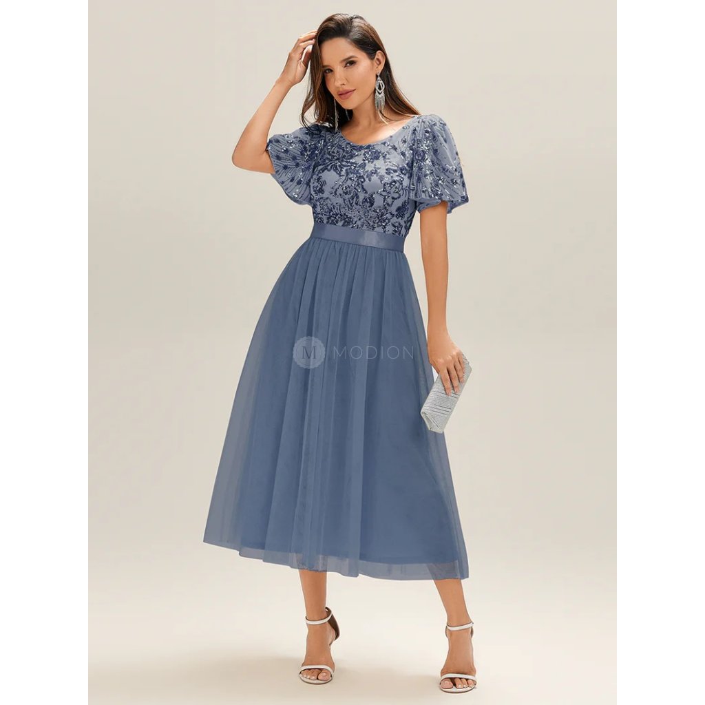 Společenské šaty Delphine: Modrošedé dlouhé tylové šaty se zdobeným živůtkem a třpytem, ideální na ples i svatbu.