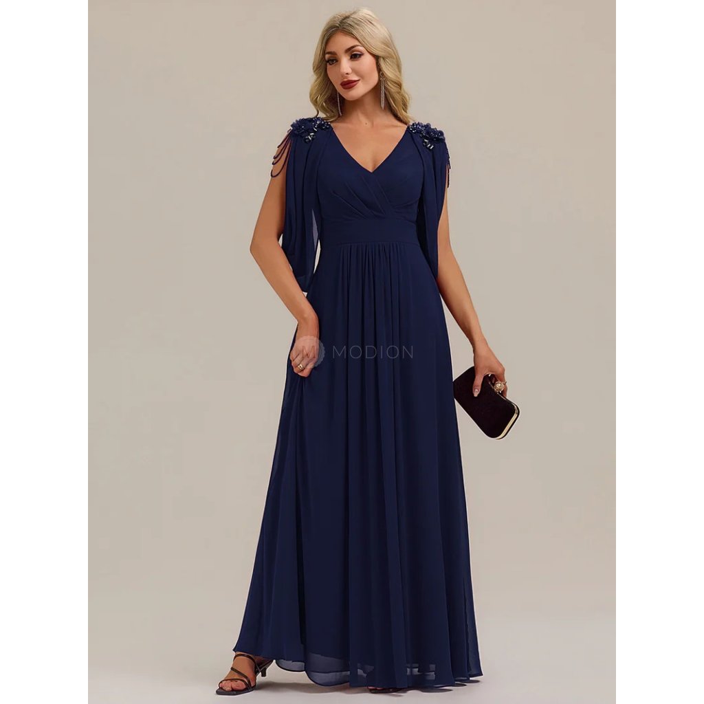 Lehký šifonový materiál dodává šatům vzdušnost a krásný plynulý pohyb, který prodlužuje siluetu a působí velmi elegantně při chůzi i tanci. Jemně řasený živůtek lichotí postavě a přirozeně tvaruje horní partii. Variabilně řešené rukávy umožňují dva způsoby nošení a dodávají modelu zajímavý stylistický prvek. Dekorativní květinové aplikace na ramenou doplněné jemnými řetízkovými detaily přinášejí luxusní, ženský akcent, aniž by celek působil okázale. Celkový dojem je harmonický, reprezentativní a velmi elegantní.