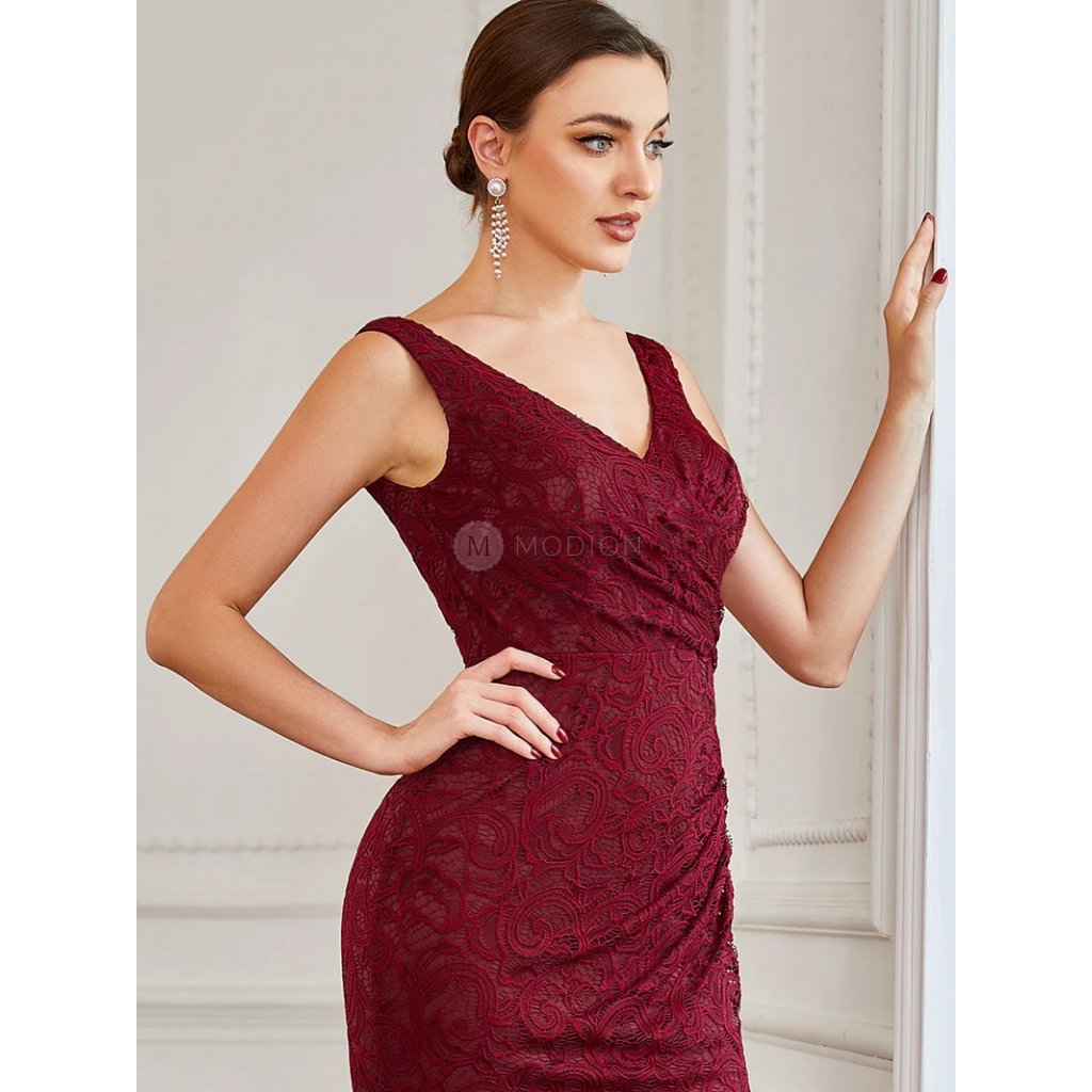 Vínové krajkové společenské šaty s luxusním vzhledem a noblesním šarmem. Jemná krajka s plastickým vzorem je mírně poddajná, takže se šaty krásně přizpůsobí postavě, zatímco vypasovaný střih zdůrazní ženské křivky. Výstřih do V působí elegantně a prodlužuje siluetu, dlouhá sukně v úzkém střihu dodává modelu slavnostní charakter.