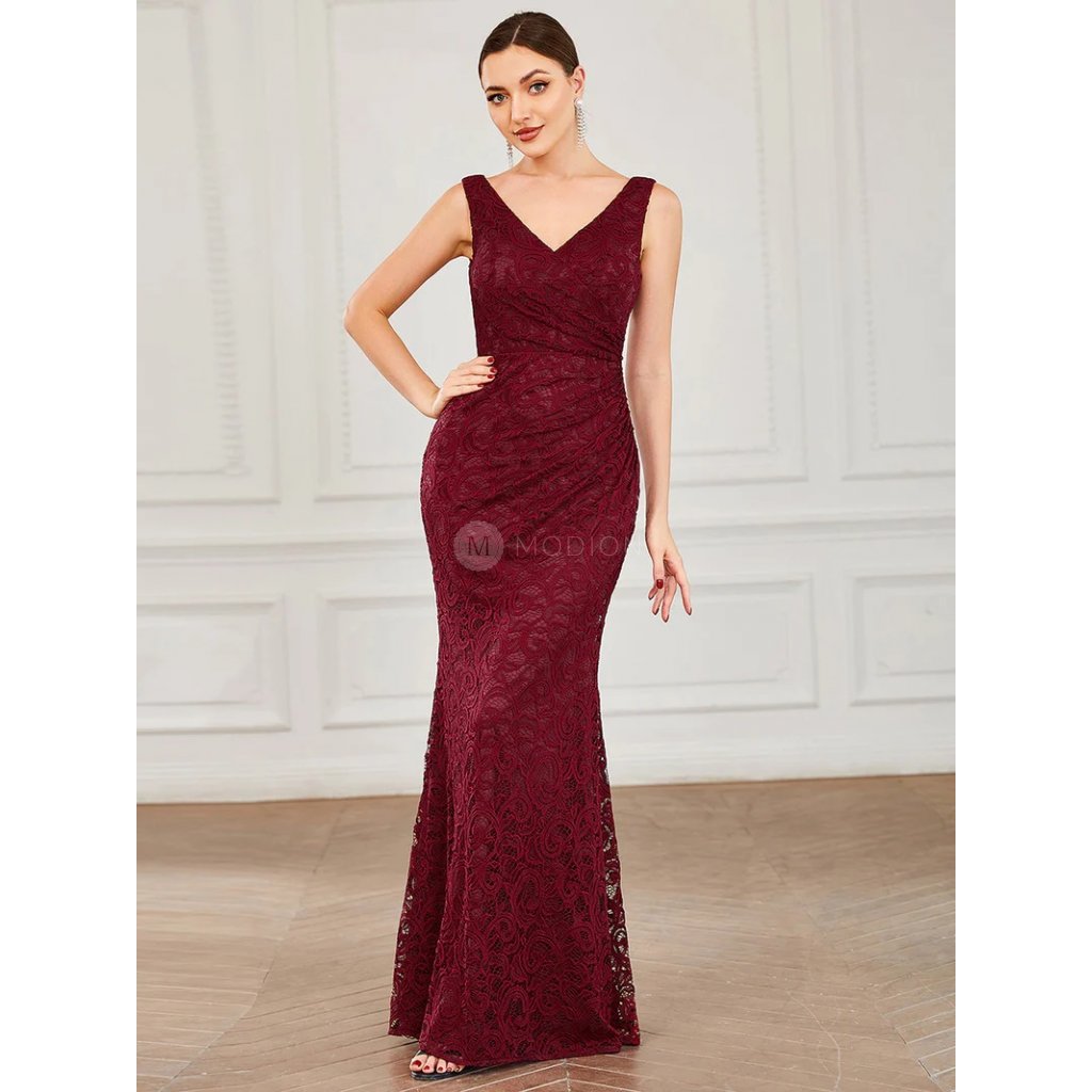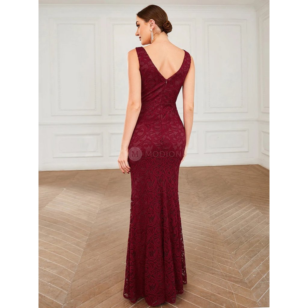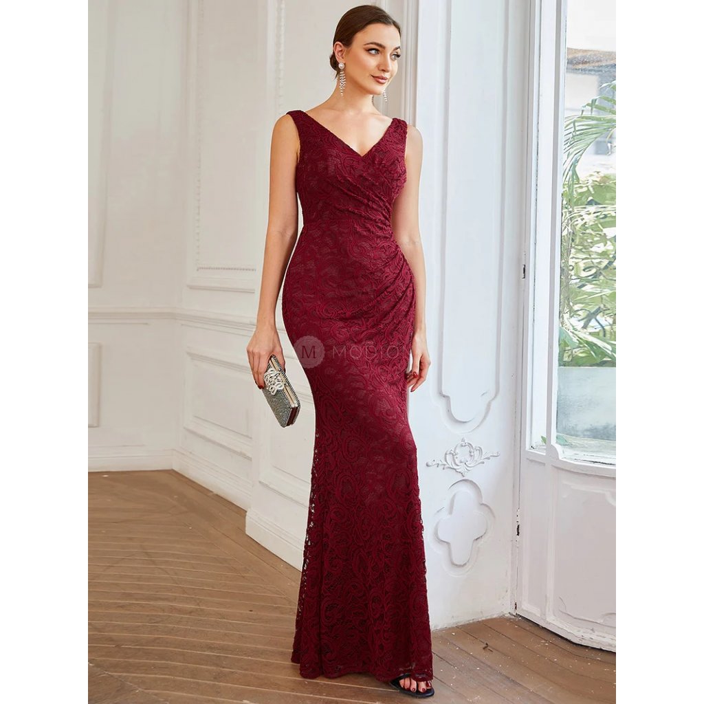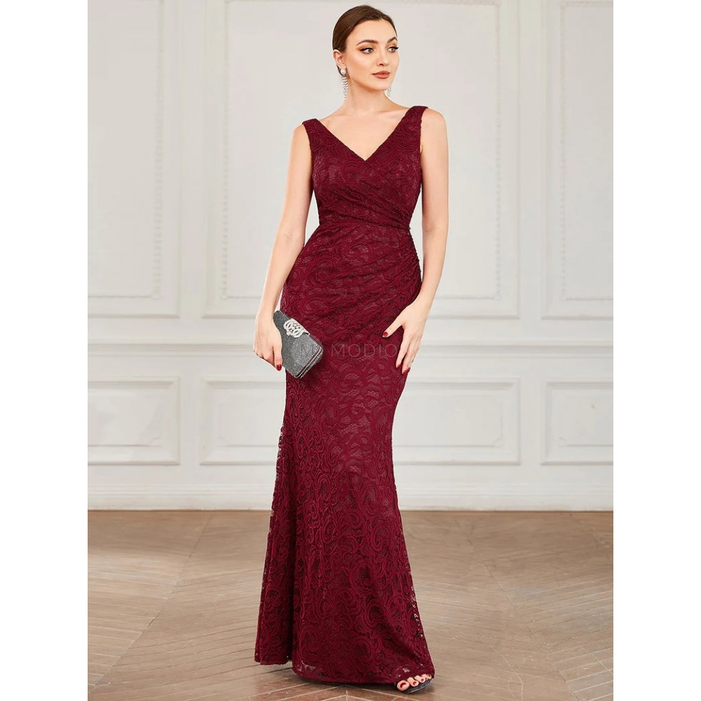 Dlouhé vínově červené společenské šaty z jemné krajky působí elegantně, slavnostně a velmi žensky. Jsou ideální volbou pro ženy, které hledají nadčasový a vkusný model vhodný pro svatební i večerní společenské události.