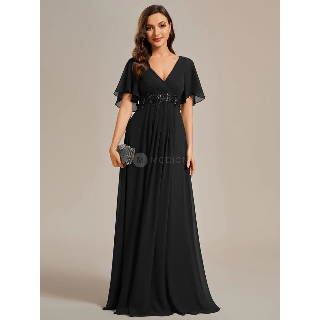 Lehký šifon dodává šatům vzdušnost a plynulý pohyb, zatímco výstřih do V krásně lichotí dekoltu a opticky prodlužuje siluetu. Zdobený pas s jemnou krajkou zvýrazňuje linii pasu a dodává modelu decentní luxusní akcent. Krátké splývavé rukávy podtrhují lehký, ženský a velmi vkusný vzhled. Dlouhá splývavá sukně působí elegantně a podtrhuje slavnostní charakter šatů. Celek působí harmonicky, nadčasově a velmi reprezentativně.